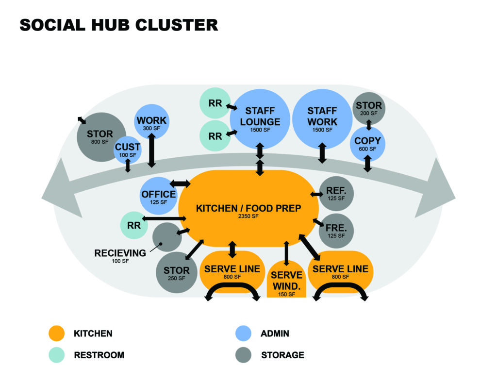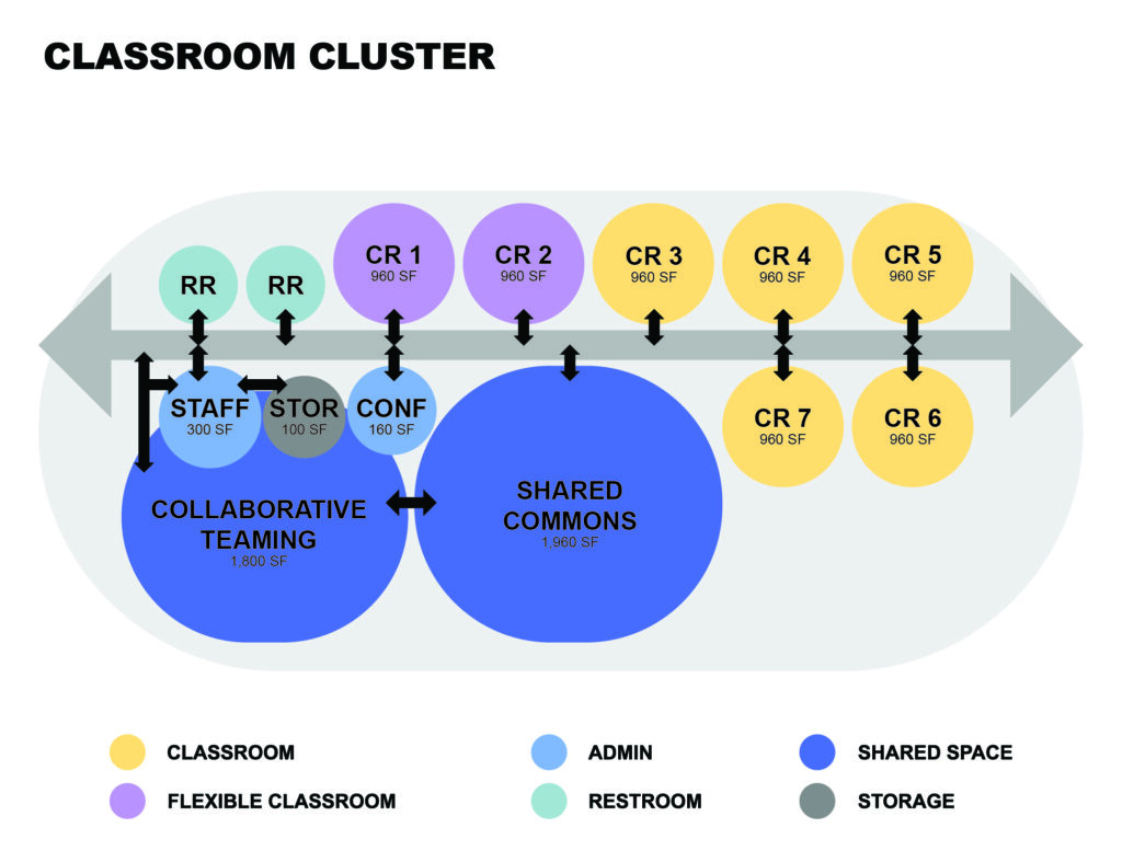 Organization: Multiple zones for quiet reflection, large group dining, and informal peer interactions; optimized line-of-sight for supervision; integrated with circulation routes to and from instructional spaces.