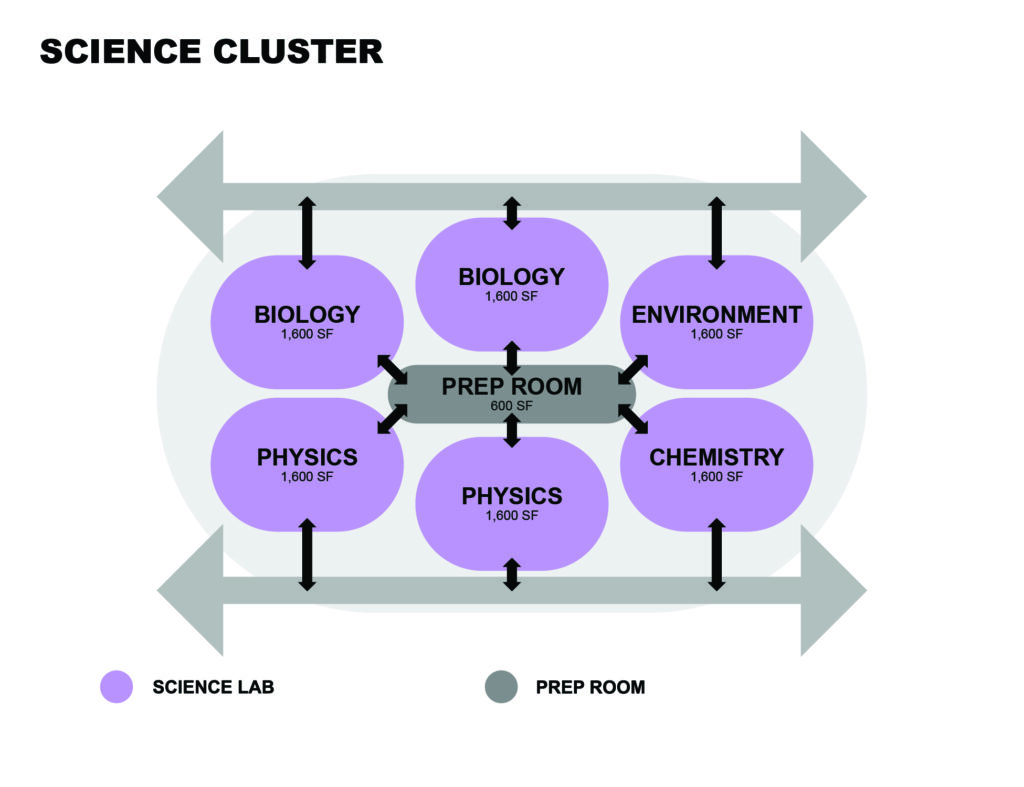 Design Objectives: Enable inquiry-based learning and hands-on experimentation with a high standard of safety and visibility; balance lecture and active lab use; accommodate small group scientific investigation. Include biophilic and sensory-supportive design strategies to improve comfort and engagement. Ensure inclusive access to science spaces for students of all physical and cognitive abilities, incorporating adaptable lab configurations.