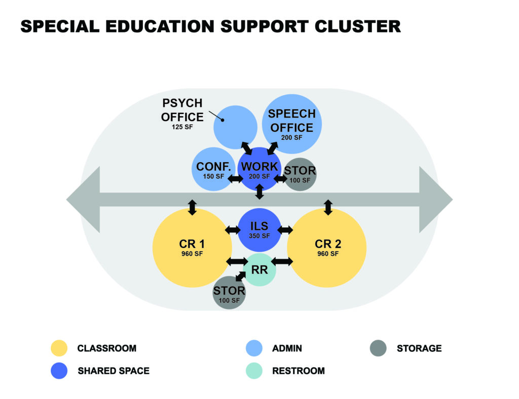 Design Objectives: Create inclusive, dignified, and flexible learning environments tailored to meet diverse student needs across the spectrum of disabilities. Spaces must support academic, behavioral, communication, and social-emotional goals. Emphasize safety, calmness, adaptability, and integration with general education classrooms. Design shall enable co-teaching, push-in and pull-out services, and support the full inclusion continuum.