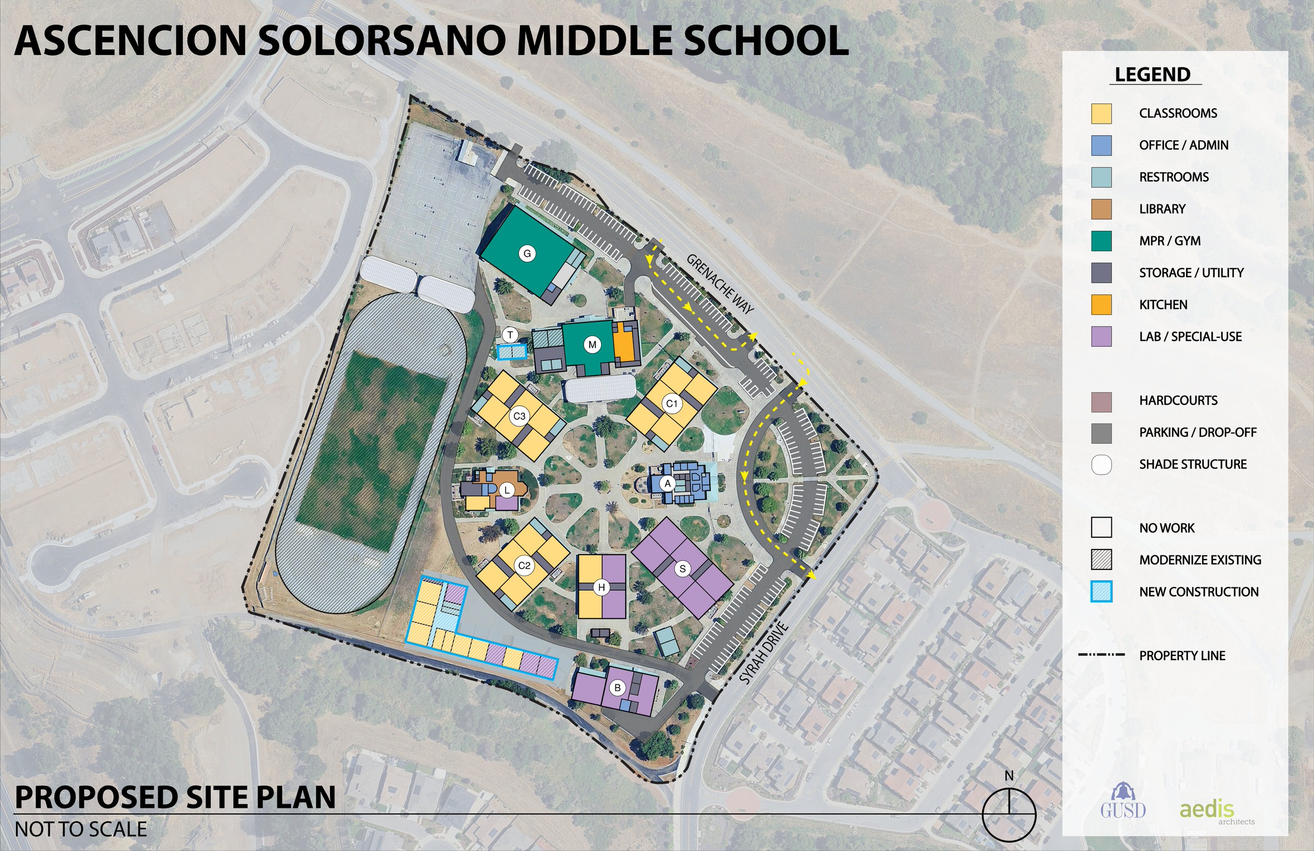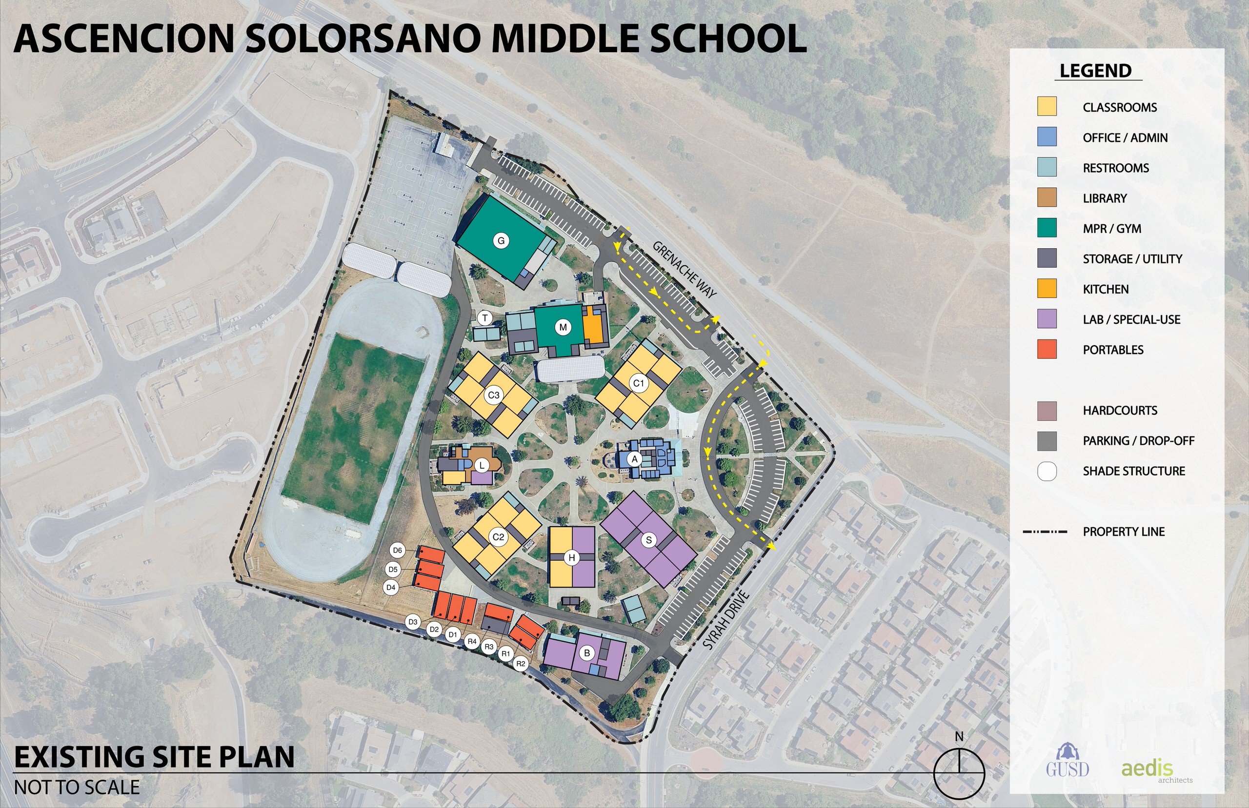 Ascencion Solorsano Middle School is organized around a central outdoor quad, with permanent classroom buildings arranged in a radial configuration connected by concrete walkways. Planter areas with mature trees and outdoor seating are distributed throughout the site. The administration building is located east of the quad, with the main entrance oriented toward the parking and drop-off zone at Grenache Way and Syrah Drive. The library sits opposite the administration building, fronting the track and field at the rear of the campus. The multipurpose building, gym, basketball courts, and solar shade structures frame the upper campus, while classroom portables are located along the lower campus perimeter. Additional parking is provided along Grenache Way and Syrah Drive. Overall, the campus is in good condition and offers opportunities for enhanced outdoor learning and gathering spaces.
