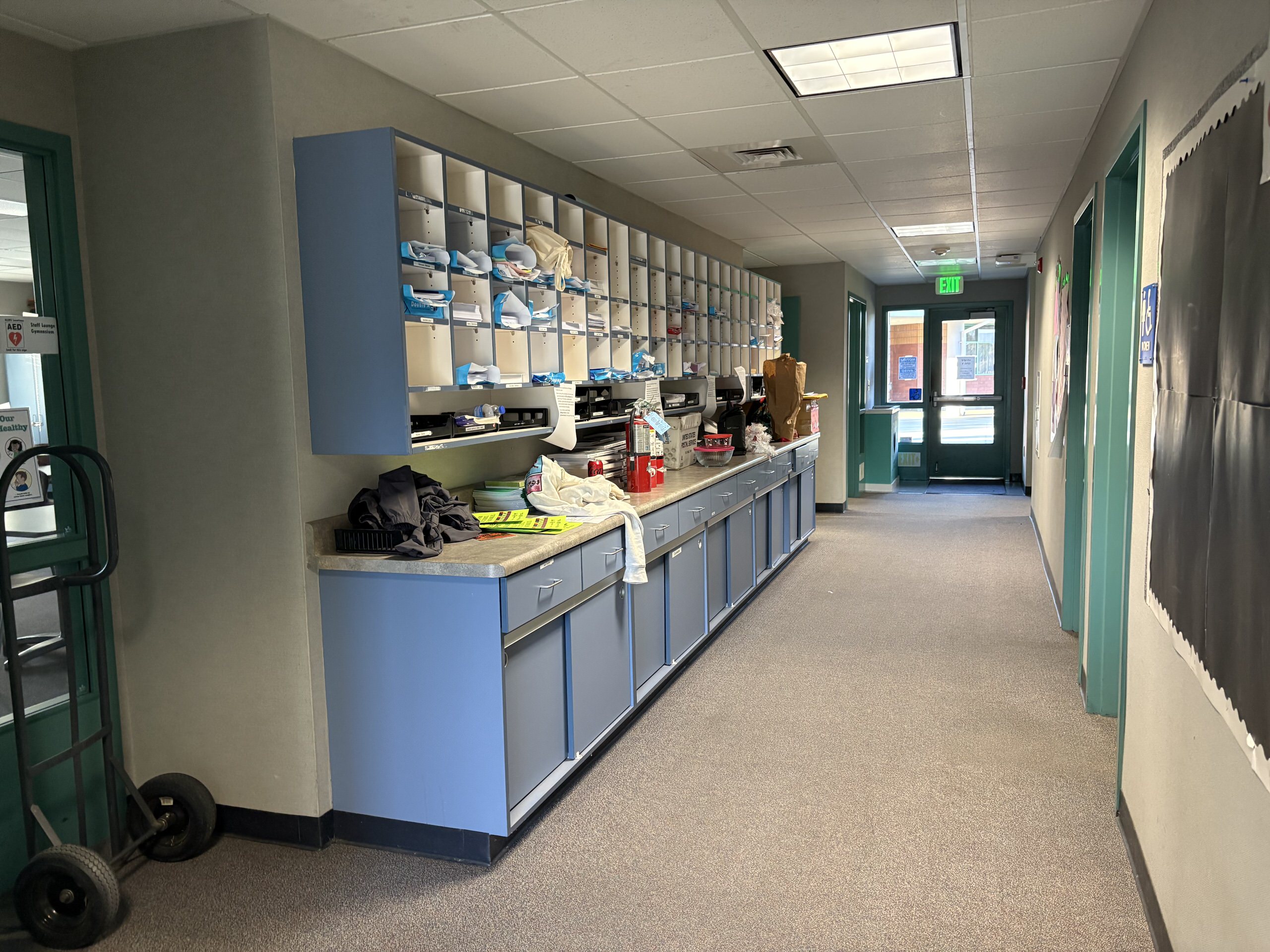 The administration building fronts the primary drop-off area at Grenache Way and Syrah Drive. Visitors approach through a landscaped entry with shade, seating, and a covered walkway. Inside, the reception area is divided between administration and student services, with a centrally located nurse’s office. Adjacent spaces include faculty workrooms, offices, restrooms, storage, and a large staff lounge with access to a private outdoor patio. Casework and workstation furnishings are coordinated in color, though some furnishings appear dated. Overall, the administration building is in good condition and adequately supports campus operations.