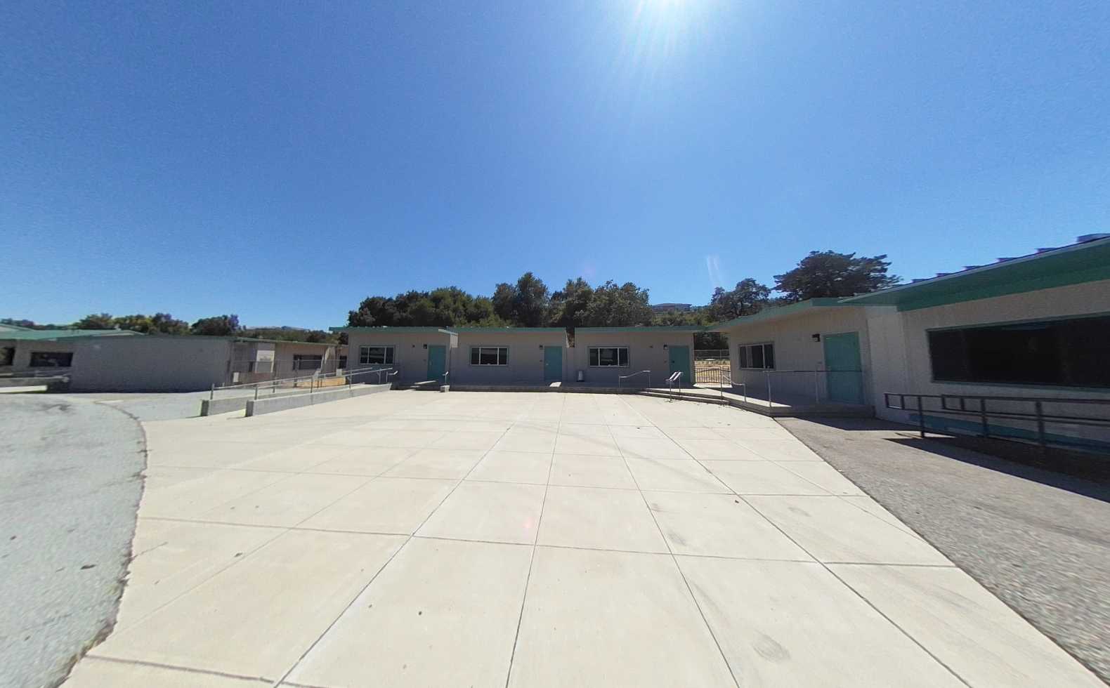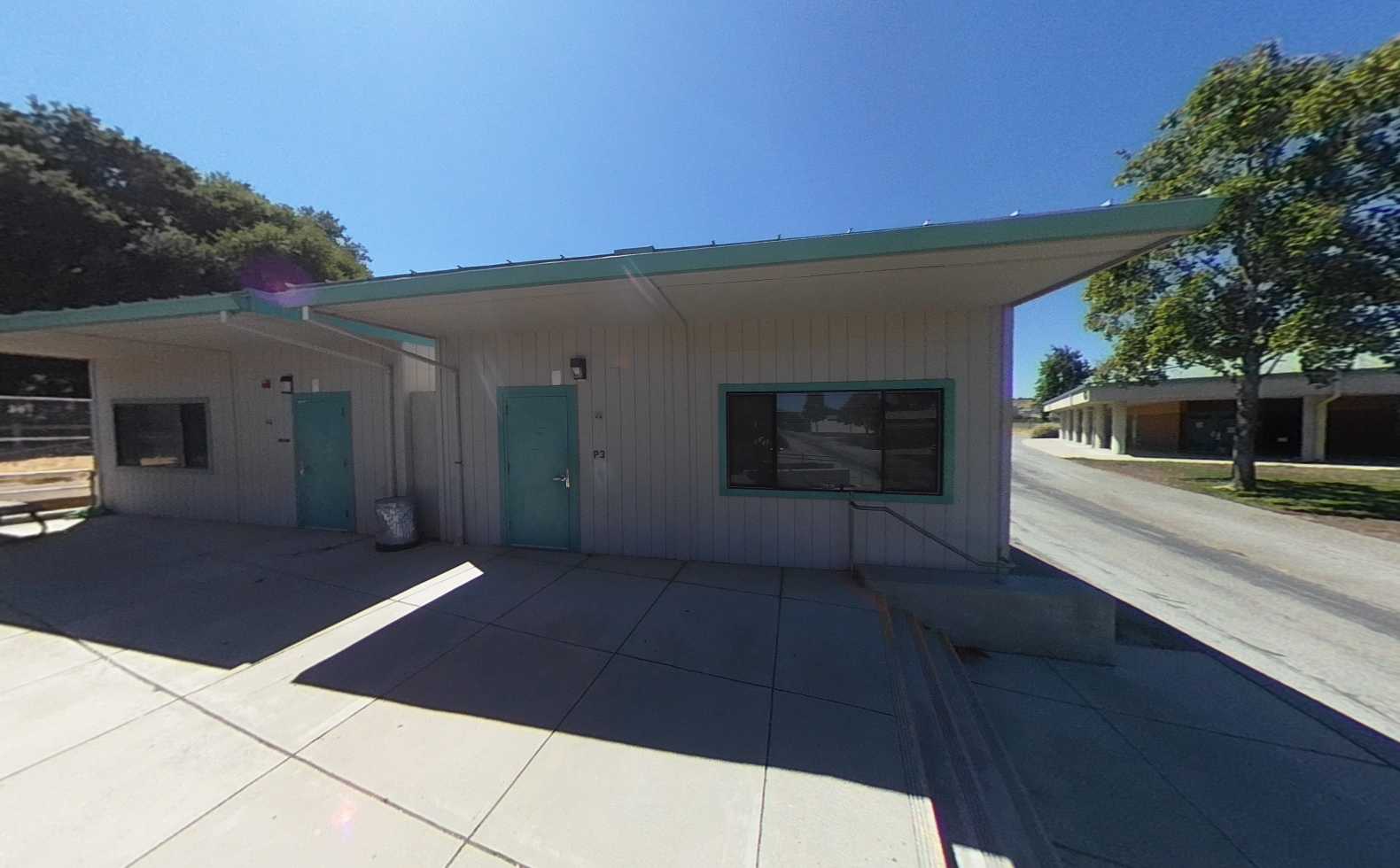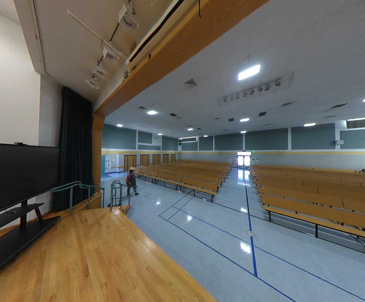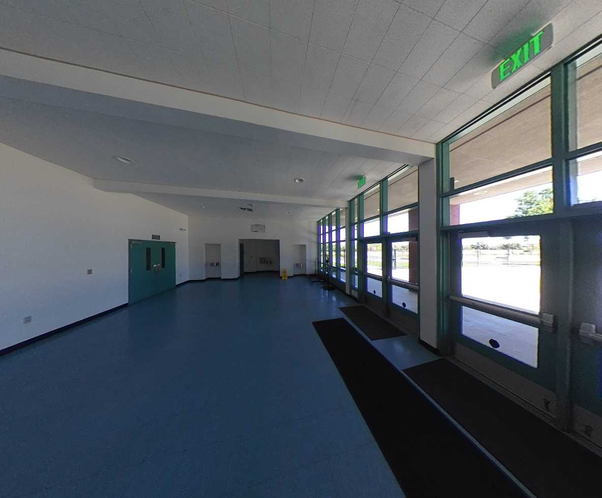Located on the north side of the campus, the multi-purpose building is accessed through a large outdoor gathering and eating area. The interior features high ceilings, clerestory windows with window covering, acoustic and tackable wall panels, and a stage with theater capabilities. A kitchen occupies the east side of the building, supported by a service driveway from Grenache Way. Locker rooms are located on the west side of the structure and within an adjacent portable; however, these spaces lack restrooms, sinks, and adequate storage, limiting full functionality.