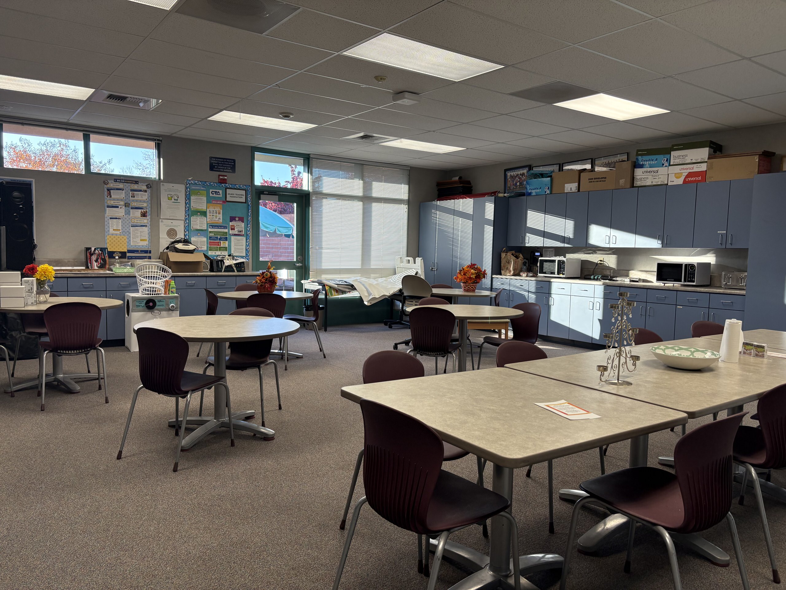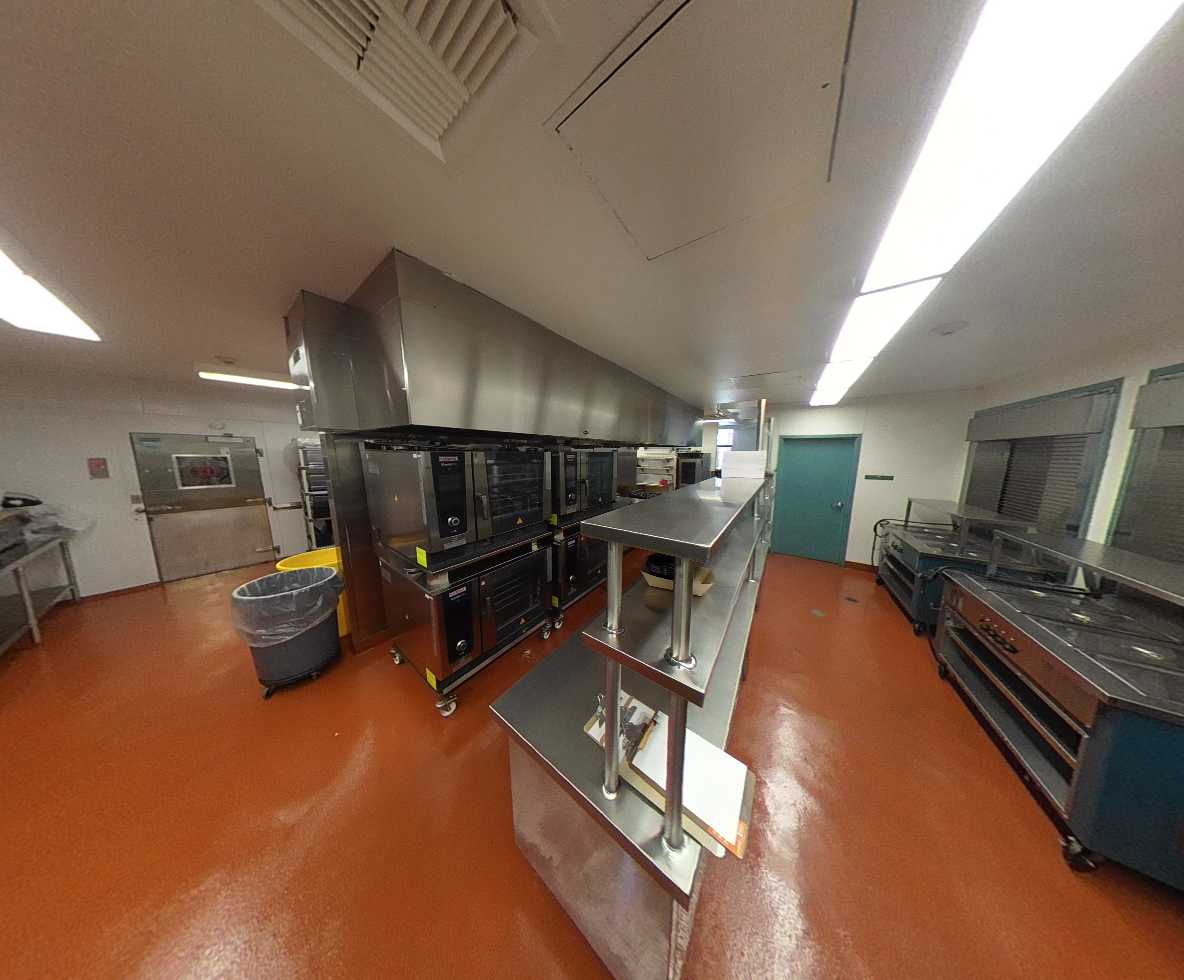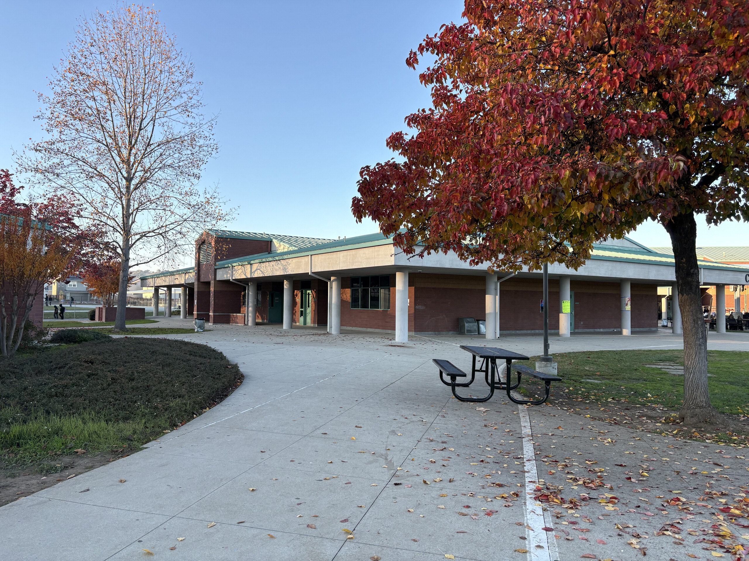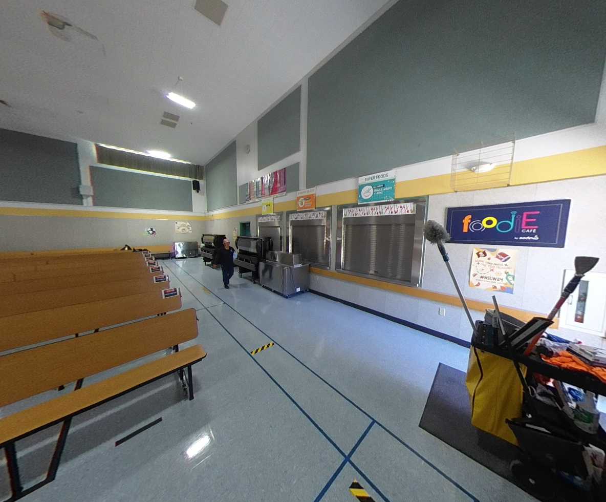Located on the north side of the campus, the multi-purpose building is accessed through a large outdoor gathering and eating area. The interior features high ceilings, clerestory windows with window covering, acoustic and tackable wall panels, and a stage with theater capabilities. A kitchen occupies the east side of the building, supported by a service driveway from Grenache Way. Locker rooms are located on the west side of the structure and within an adjacent portable; however, these spaces lack restrooms, sinks, and adequate storage, limiting full functionality.