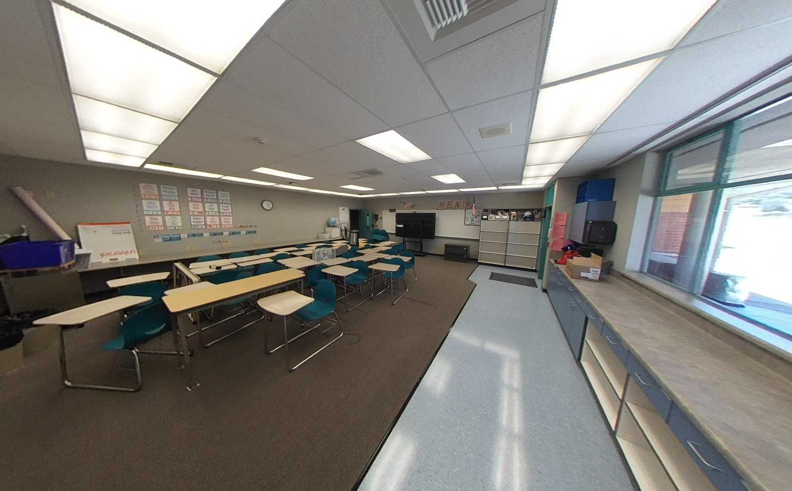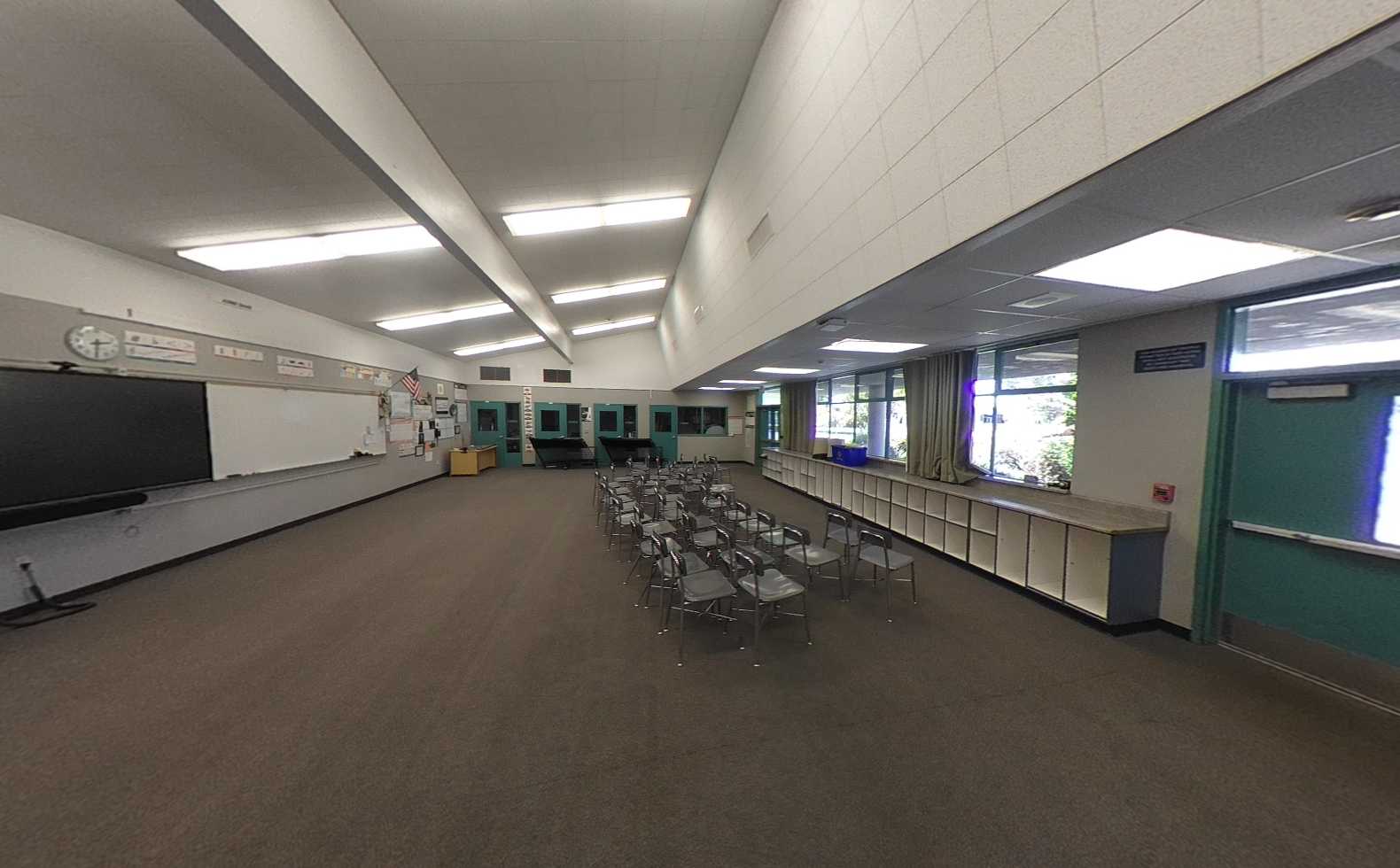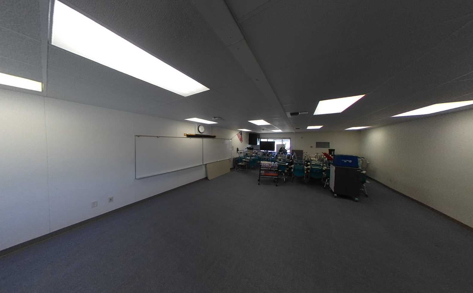 Interiors include a combination of carpet and vinyl flooring, tackable wall panels, casework storage, and heavy furnishings that, while functional, are dated. Portable classrooms contain minimal casework and movable desks, reflecting limited flexibility. The music building offers high ceilings and perimeter casework, with window covering at the front-facing windows. The adjacent multimedia lab is significantly underutilized and currently functions as storage. Overall, classroom facilities are in fair condition but would benefit from been updated.