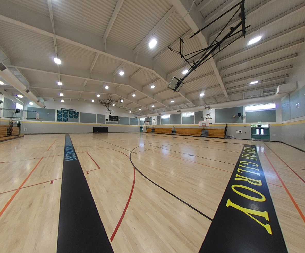 The gymnasium sits north of the multi-purpose building and includes high ceilings, clerestory windows, retractable bleachers, and indoor courts. The main entrance opens to an interior reception area with large windows and direct restroom access. The west facing side of the gym experience issues with glare which reduce its usability. This could be addressed by adding window covering or tinting. Overall, the gym is well-maintained and in good condition.