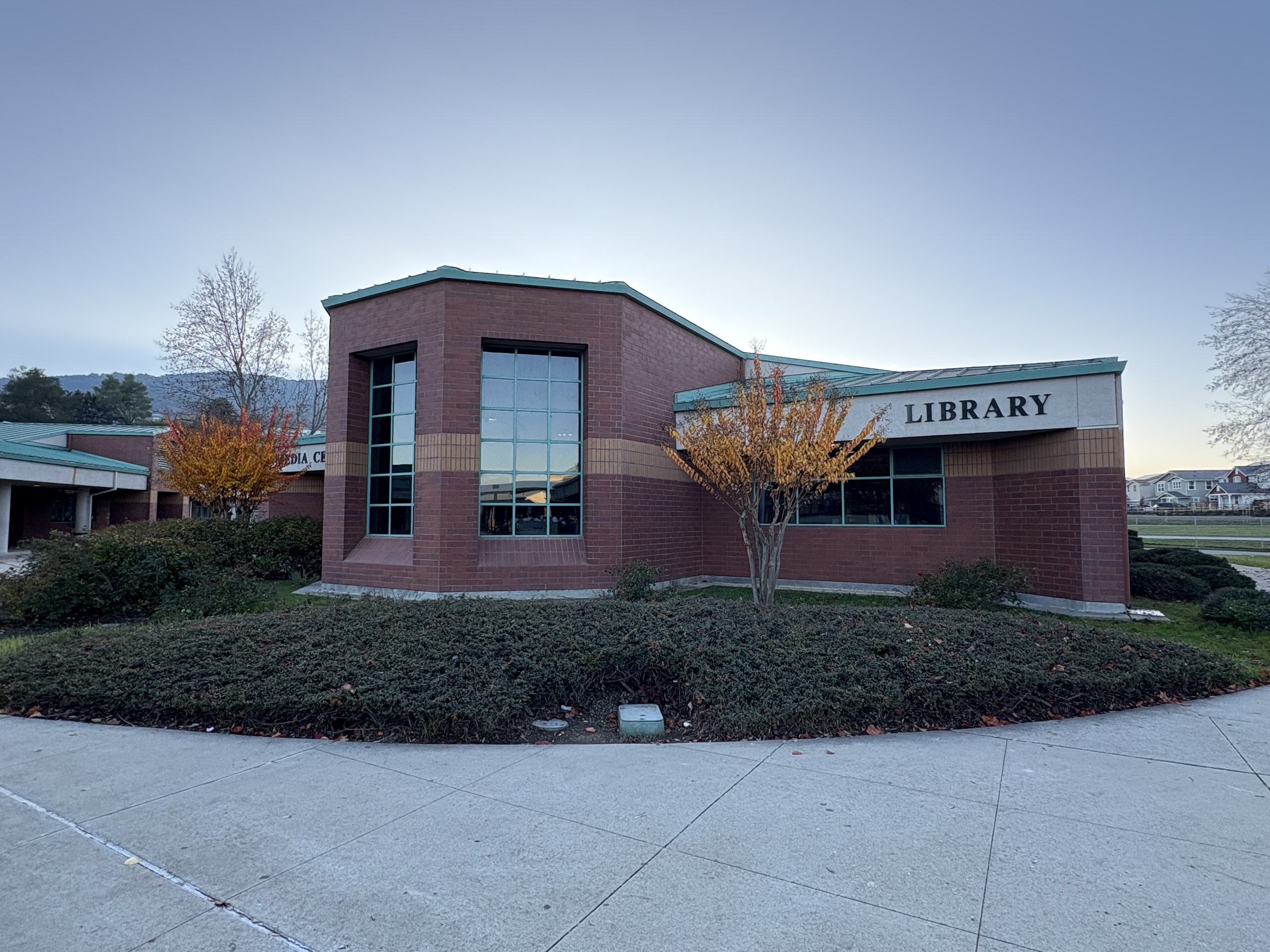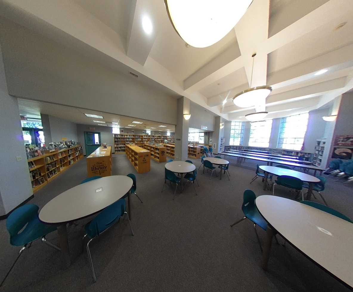 The library is situated east of the central quad, opposite the administration building and adjacent to the track and field. In addition to the main library space, the building includes two classrooms, storage areas, restrooms, and faculty workspaces. Dual entrances lead into a central reception desk, opening onto an expansive reading and study area furnished with round tables, seating clusters, and book stacks oriented toward a large bay window that overlooks the quad. Classrooms and support areas are located south of the main reading space. The library features tall ceilings and is in fair condition.