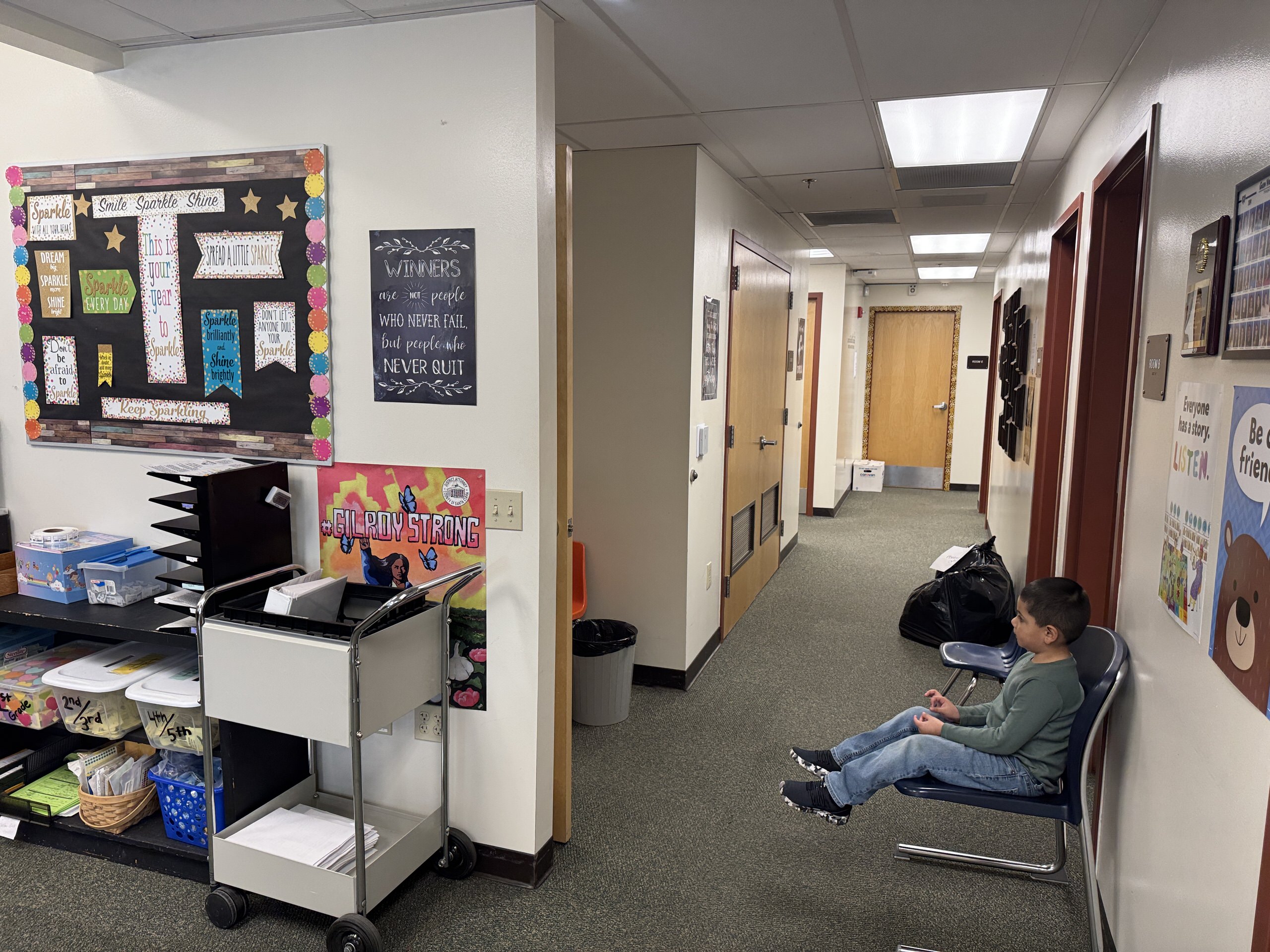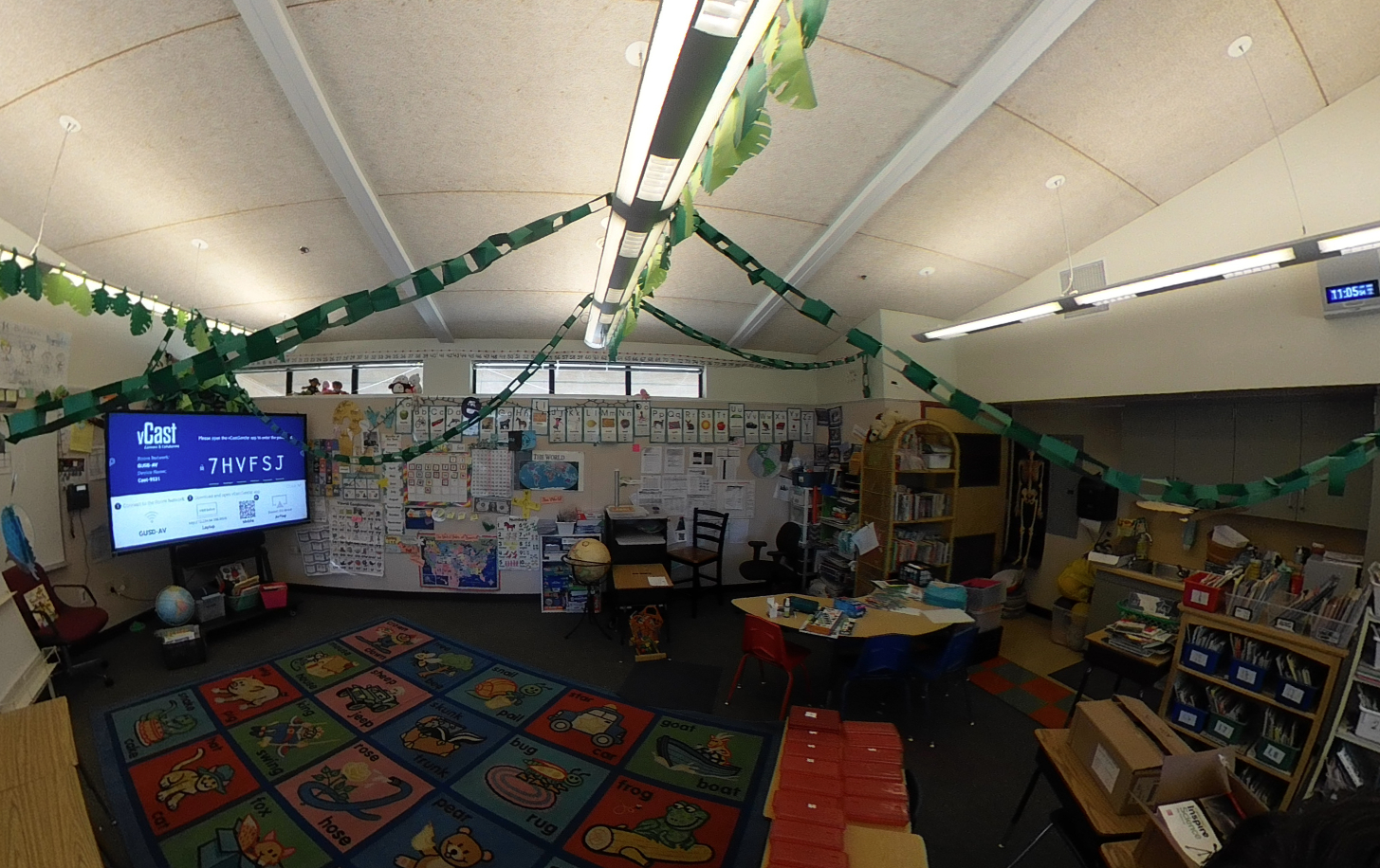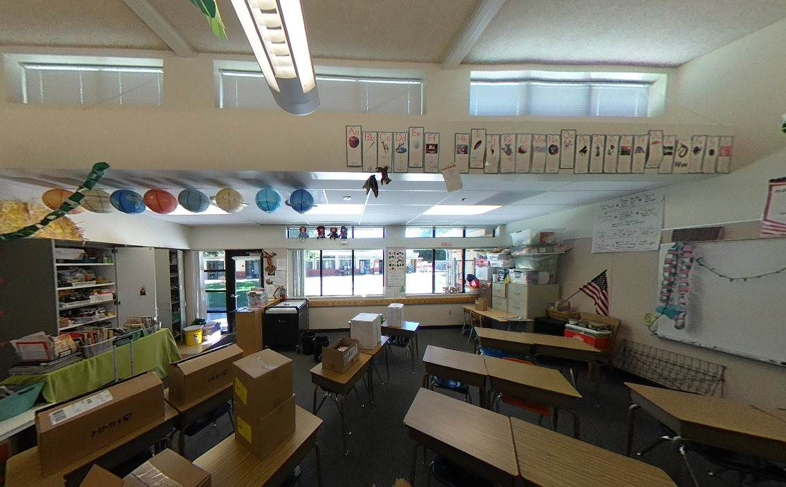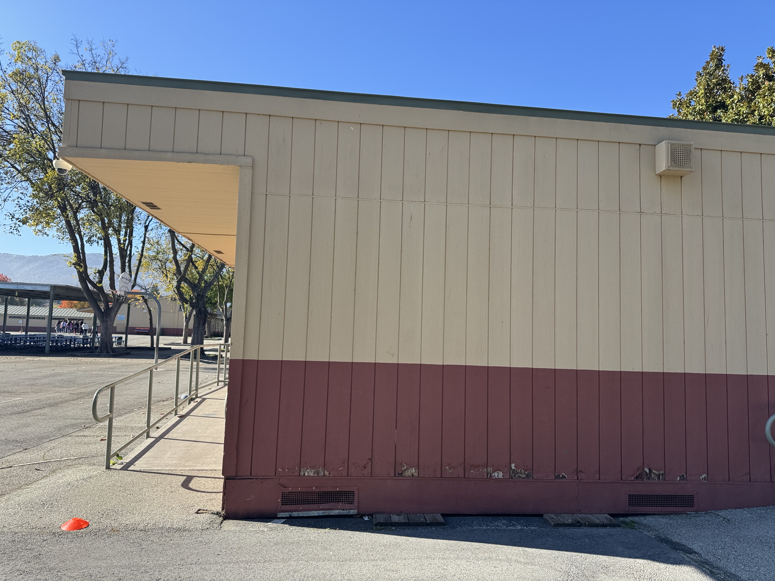 The campus includes four permanent classroom buildings (Wings A, B, O, and N), two permanent Kindergarten buildings (K and U), and nine portable classrooms. Building exteriors show deteriorated metal overhangs and gutters. Typical classrooms include operable front windows and clerestory windows with horizontal blinds. Interiors are teacher-customized and furnished with aging, heavy furniture. HVAC units located within classroom closets produce significant noise during operation. Restrooms in these buildings have high ceilings and clerestory windows, though several present accessibilities concerns. Most permanent classroom buildings are in generally adequate condition, with the exception of Building N, which is in notably poor condition.