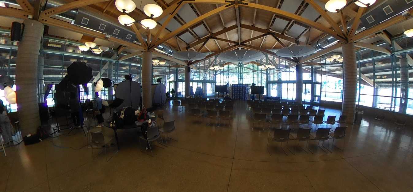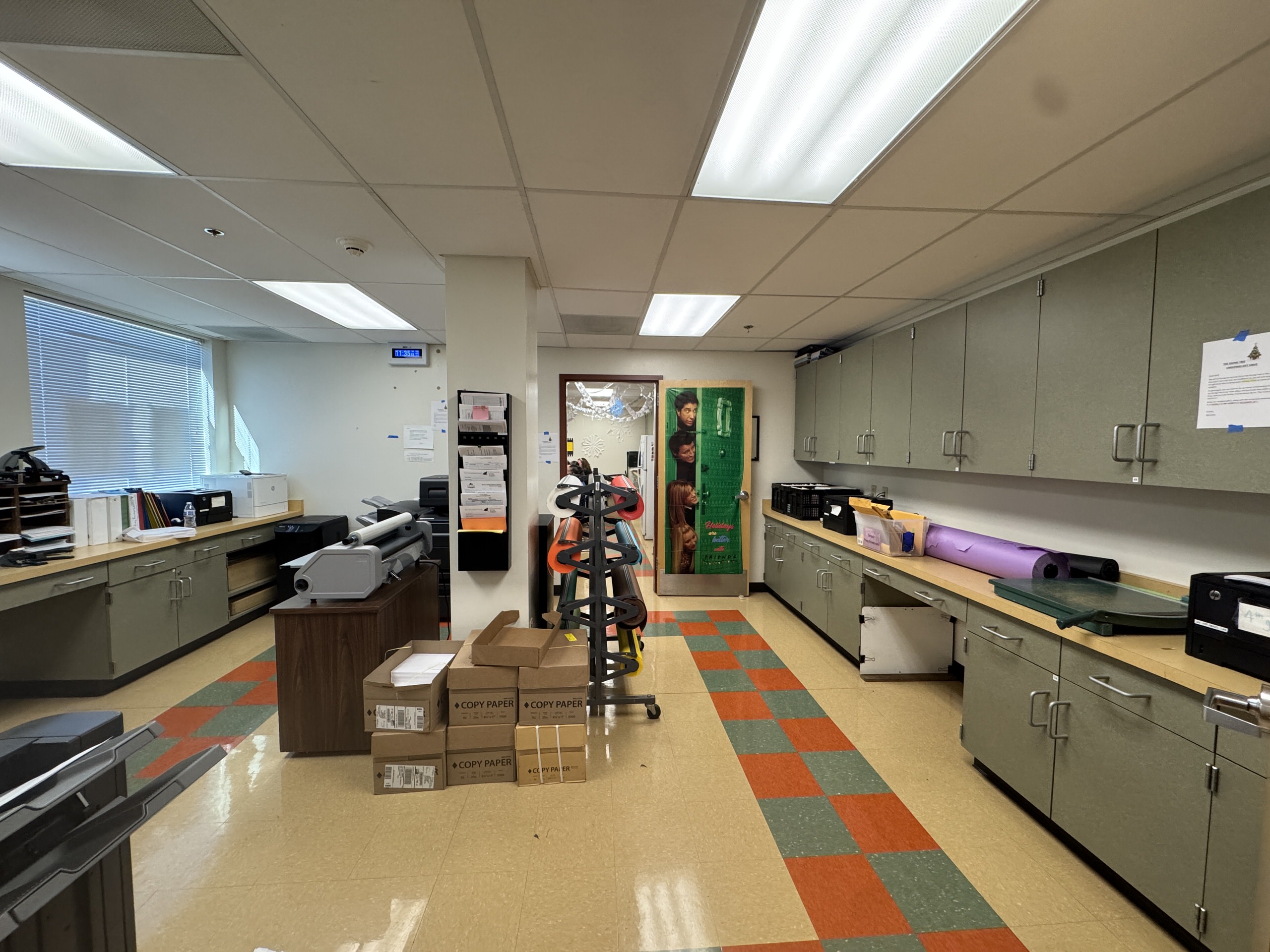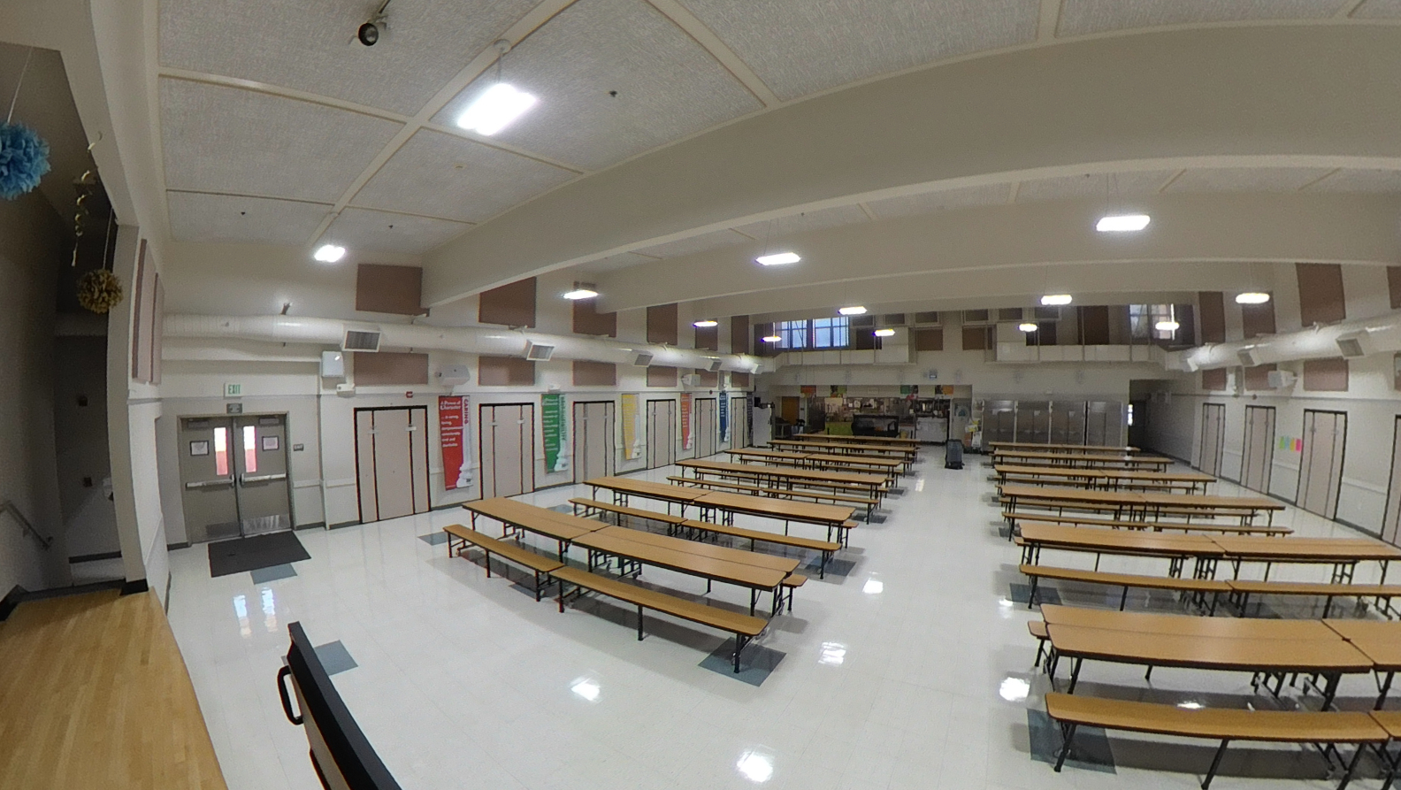 The Multi-Purpose and Library Building is located behind the Kindergarten complex, oriented toward the 9th Street drop-off area. The Multi-Purpose Room features colorful accent flooring, high ceilings with clerestory windows, perimeter lunch tables, and a stage. The kitchen opens to the Multi-Purpose Room via a large roll-up door and includes an accessible high-low drinking fountain with bottle filler. The library contains heavy round tables, large book stacks, a long computer workstation, a projector screen, and a monitor cart. A sizable reception area occupies the front of the space, with storage located at the rear. Overall, this building is in good condition.
