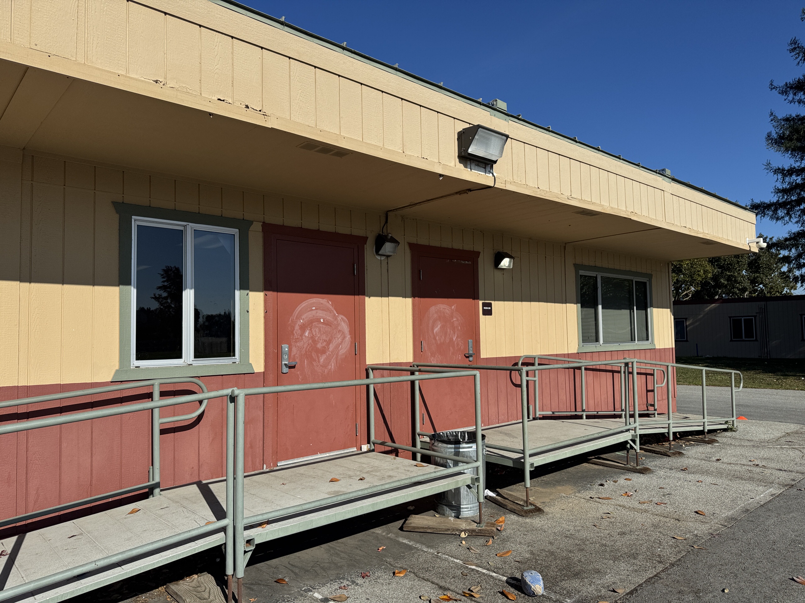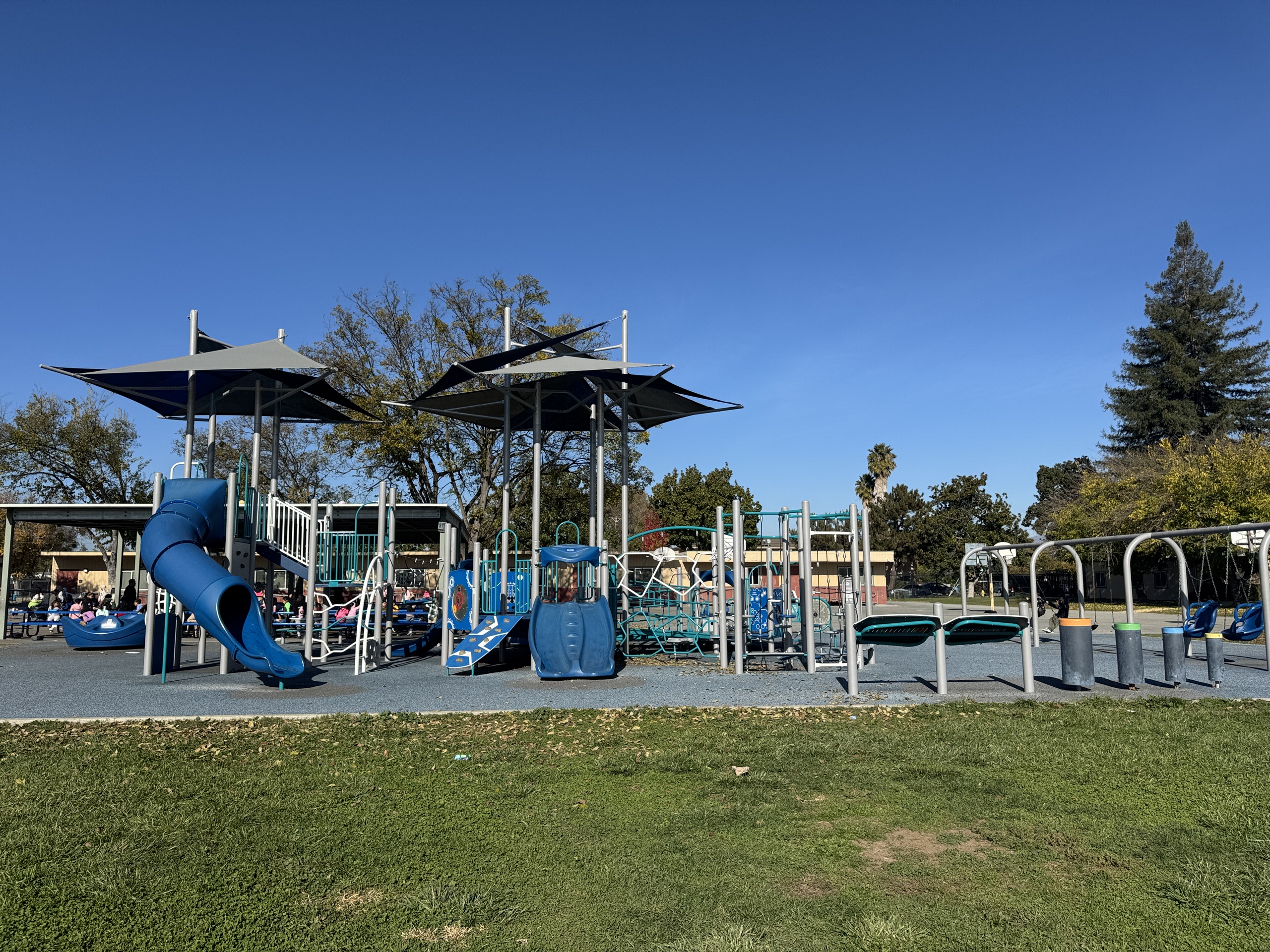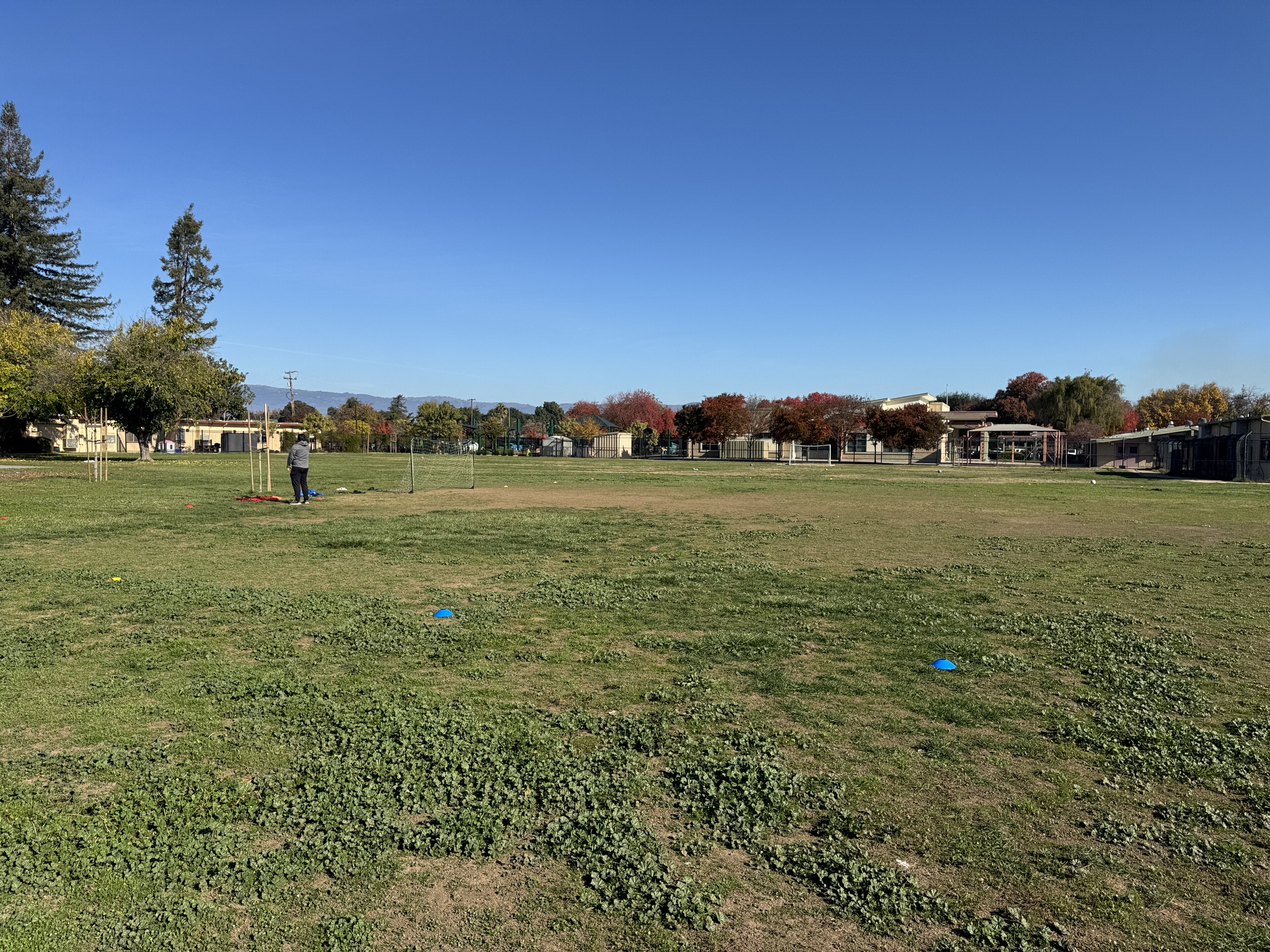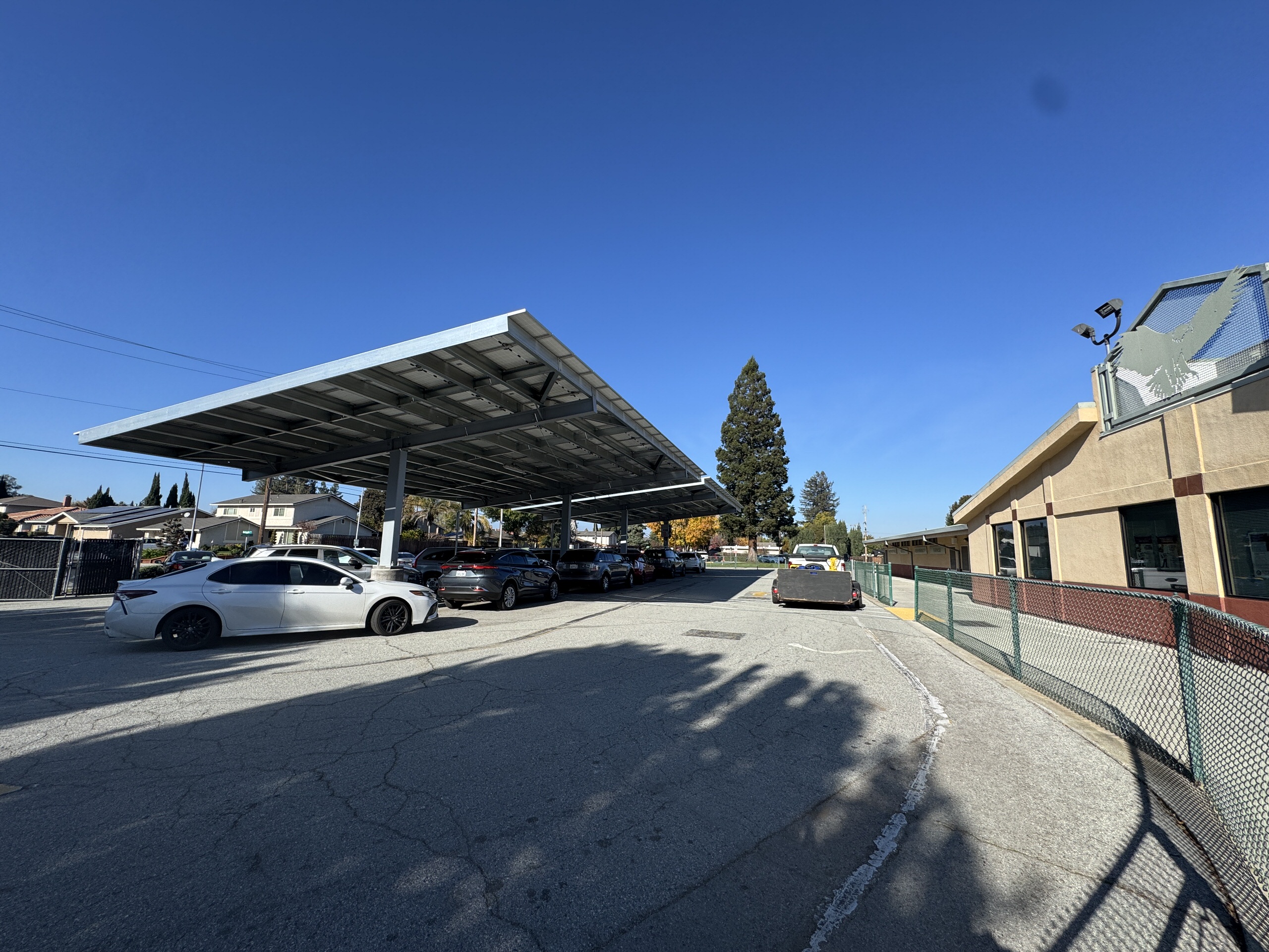 The campus includes blacktop play areas, TK/Kinder and upper-grade play structures, grass fields, solar shade structures, and mature shading trees. While the play structures are accessible, they do not provide adapted or inclusive play equipment. The covered lunch area is limited in size, and additional shade structures would significantly improve outdoor usability. The main grass field experiences substantial drainage issues, resulting in persistent muddy conditions. The site is fully enclosed by chain-link fencing. Three parking lots serve the campus, two of which also function as drop-off areas; however, there is no clearly designated visitor or parent parking, and accessible parking spaces are non-compliant. These deficiencies contribute to congestion, overcrowding, and instances of illegal parking.