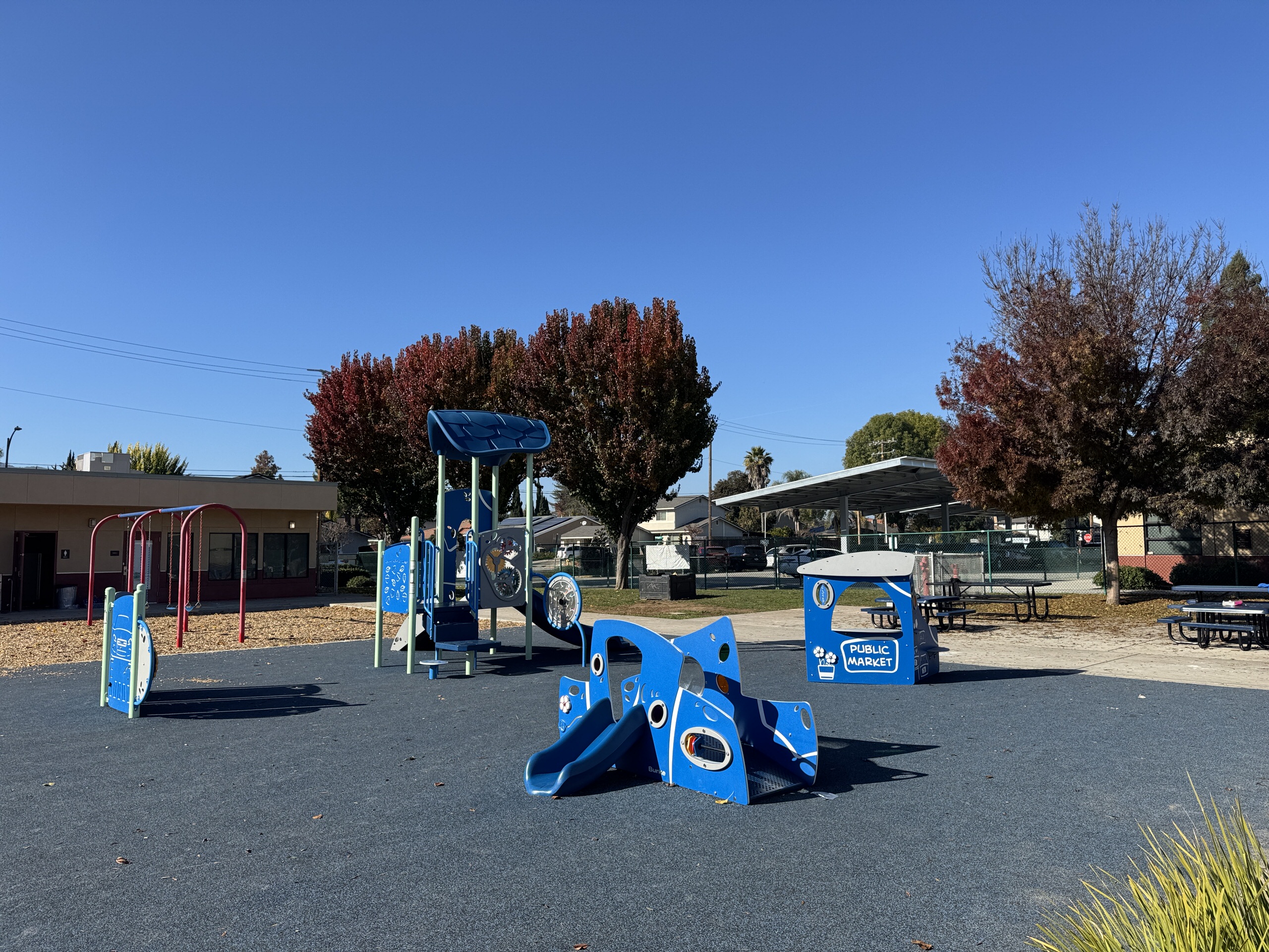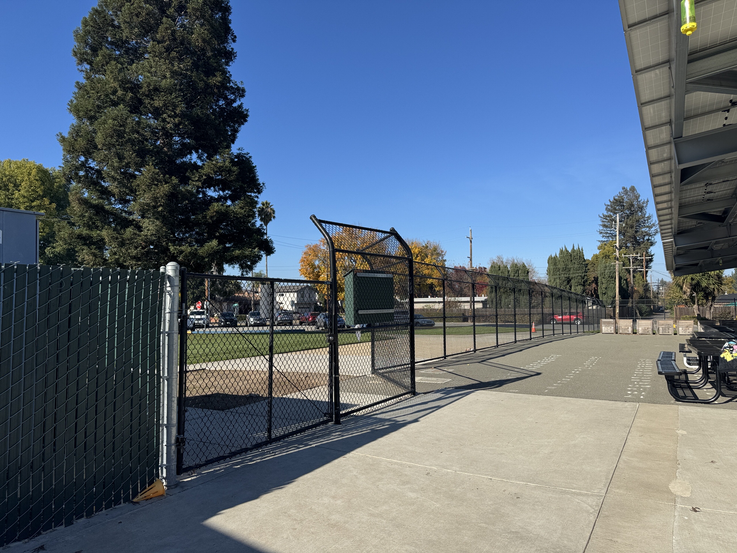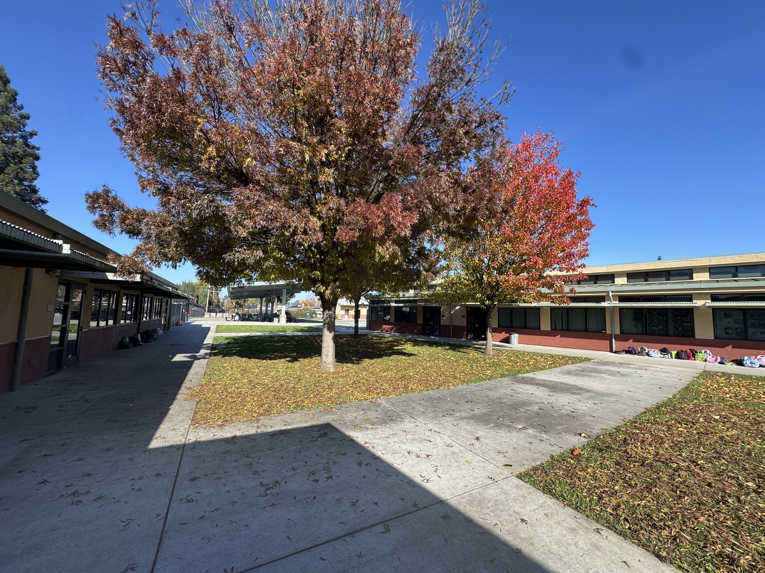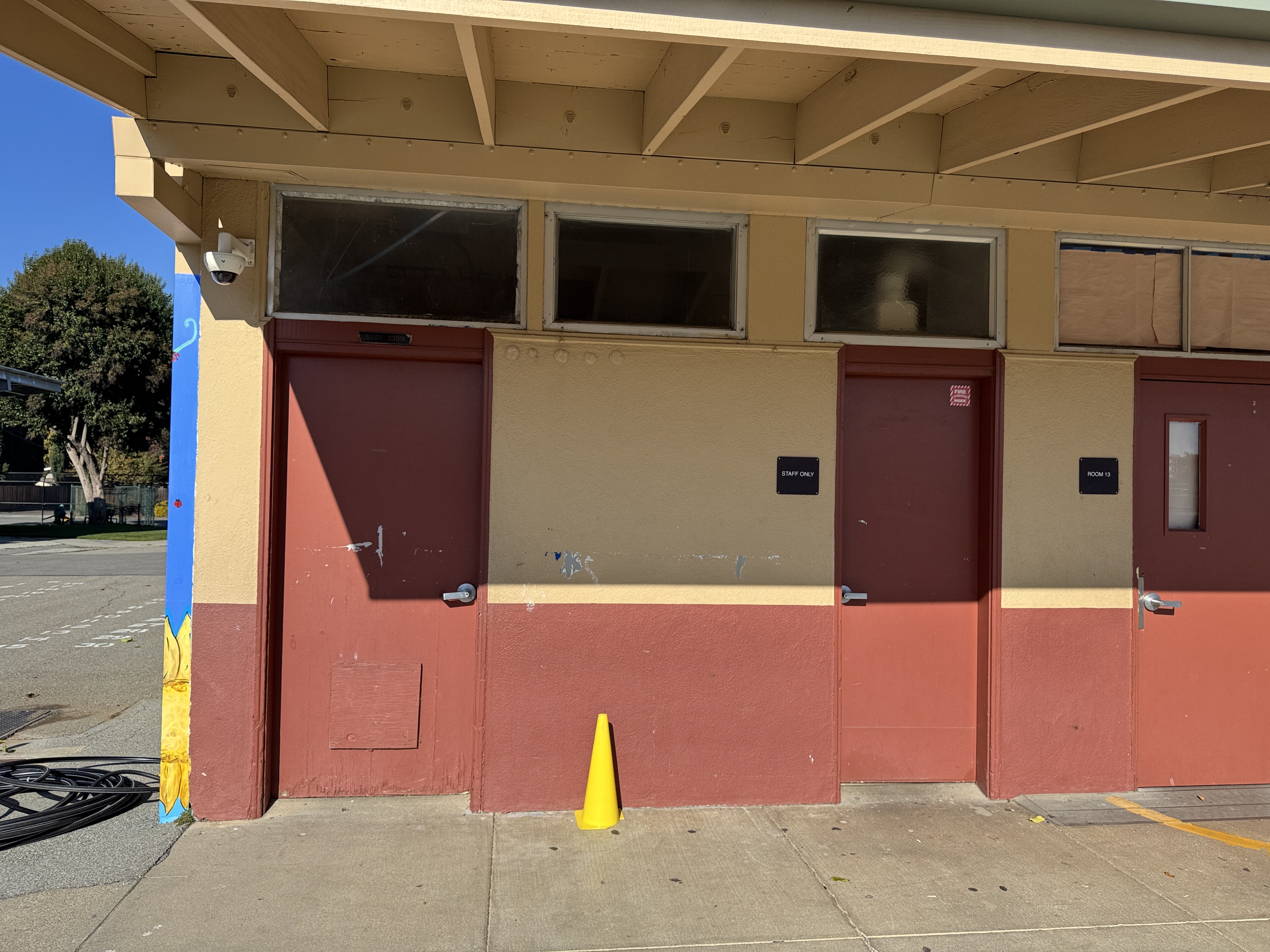 The campus includes blacktop play areas, TK/Kinder and upper-grade play structures, grass fields, solar shade structures, and mature shading trees. While the play structures are accessible, they do not provide adapted or inclusive play equipment. The covered lunch area is limited in size, and additional shade structures would significantly improve outdoor usability. The main grass field experiences substantial drainage issues, resulting in persistent muddy conditions. The site is fully enclosed by chain-link fencing. Three parking lots serve the campus, two of which also function as drop-off areas; however, there is no clearly designated visitor or parent parking, and accessible parking spaces are non-compliant. These deficiencies contribute to congestion, overcrowding, and instances of illegal parking.