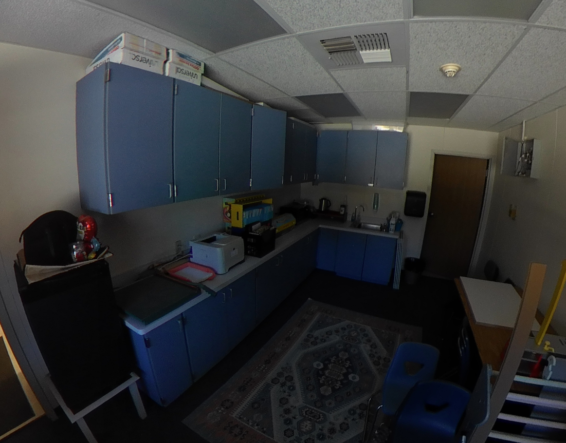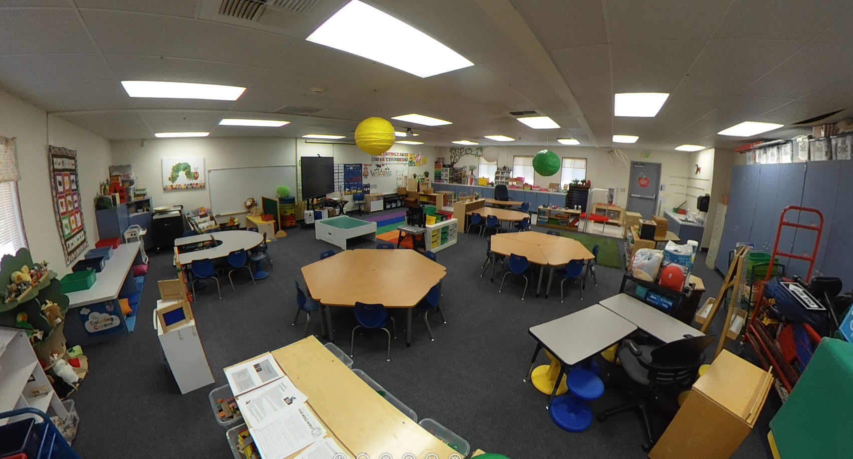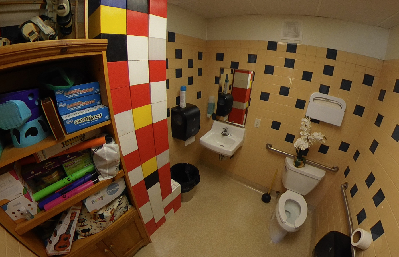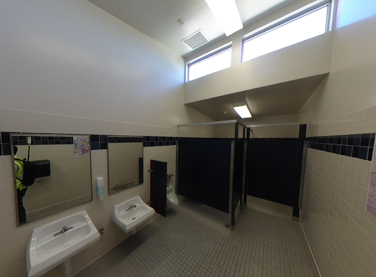 The Kindergarten buildings, located at the corner of Princevalle Street and 9th Street, form a secure and enclosed play yard oriented away from the street. These buildings provide operable windows and shallow overhangs around the play yard. Interior spaces feature colorful décor and furnishings, although both flooring and ceiling finishes are in poor condition. Shared restrooms, storage, a kitchenette, and a staff toilet connect pairs of classrooms. The student toilets are undersized and frequently overflow, resulting in recurring carpet damage.