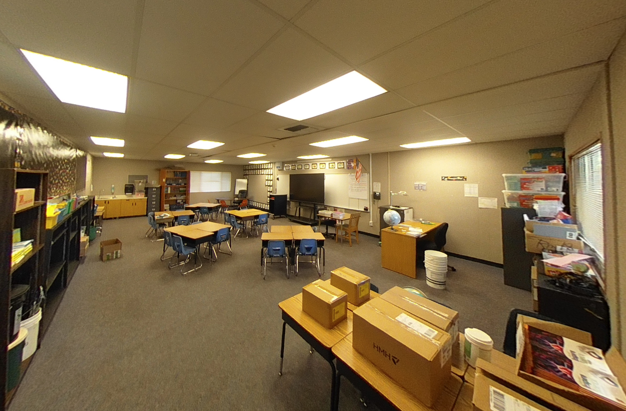 Exterior stucco across the campus is in fair condition, with localized cracking and failing joints. With the exception of the Multi-Purpose Building, most metal overhangs are in poor condition and require repair or replacement. Interior classroom finishes—including VCT and carpet flooring, suspended ceiling tiles, and tackable wall panels—are outdated and worn.
