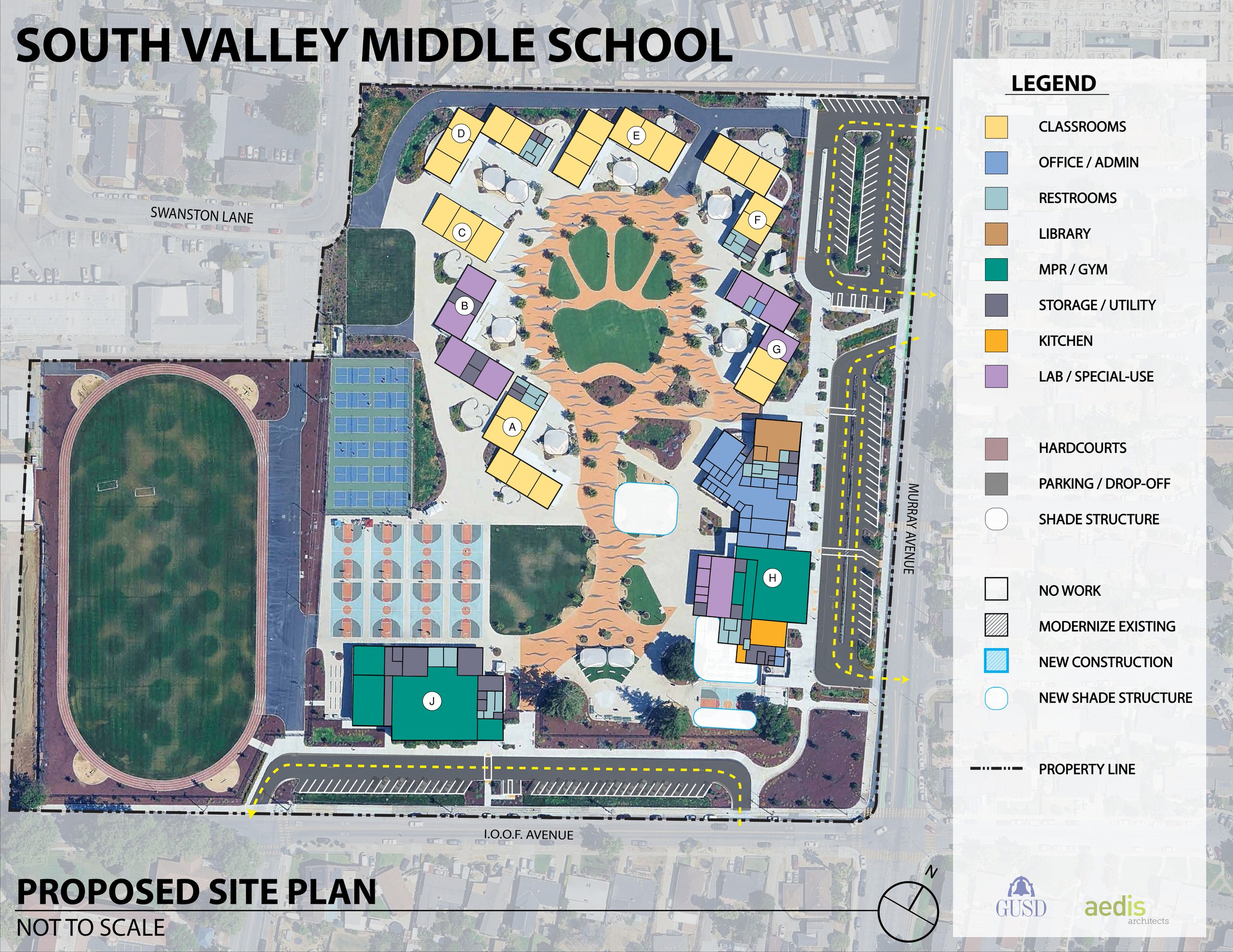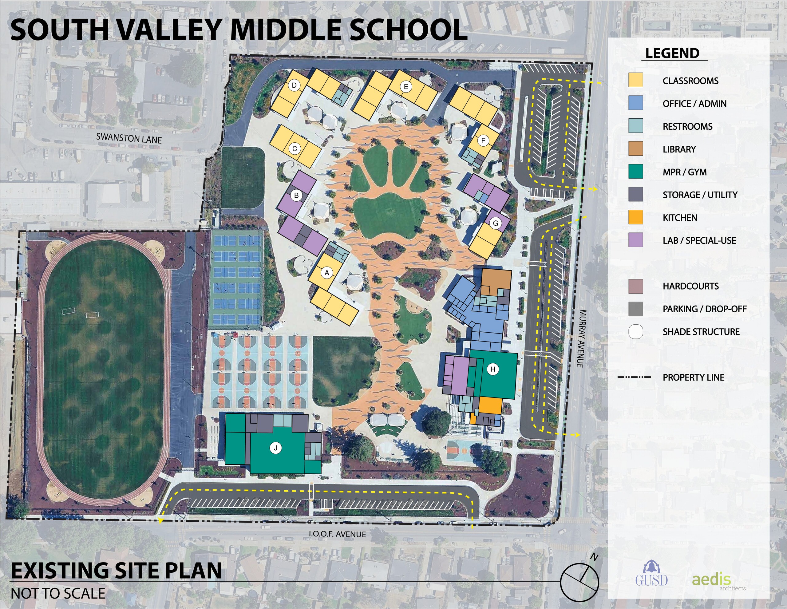 South Valley Middle School went through a full campus replacement in 2023. It consists of permanent structures using pre-engineered modular classroom buildings, an administration complex, a gymnasium, and a multi-purpose facility. Buildings are connected by brightly painted pathways, turf patches, and landscaping that lead to a central quad. Parking and drop-off areas are provided along Murray Avenue and IOOF Avenue, encompassing the campus perimeter and providing access to the track and field. Overall, the campus presents a cohesive and inviting environment with functional outdoor amenities and organized circulation.