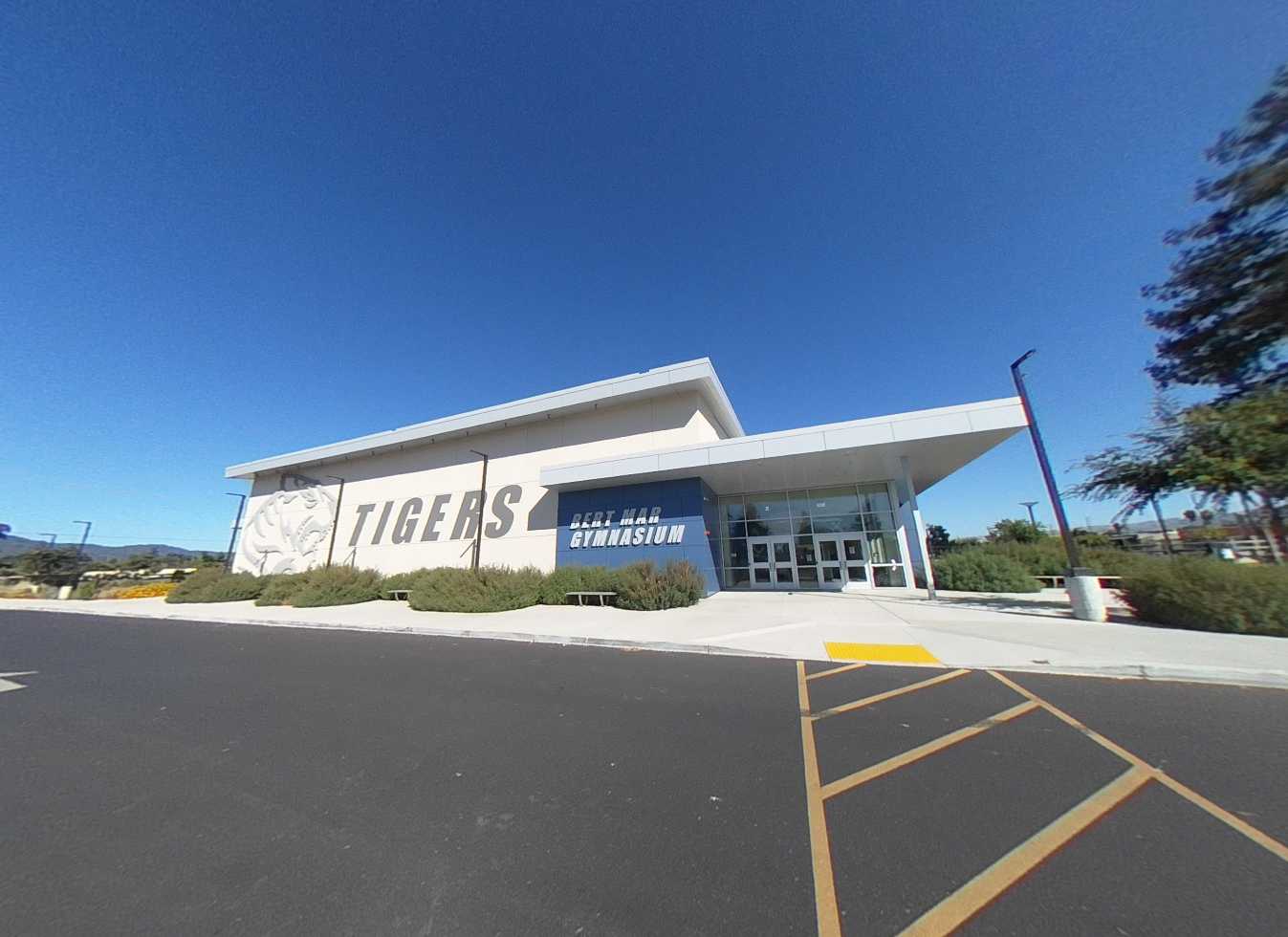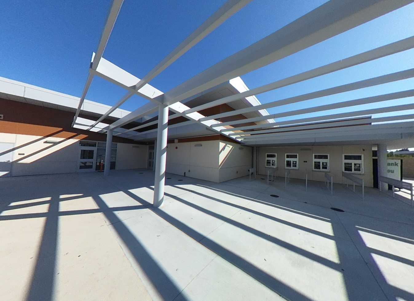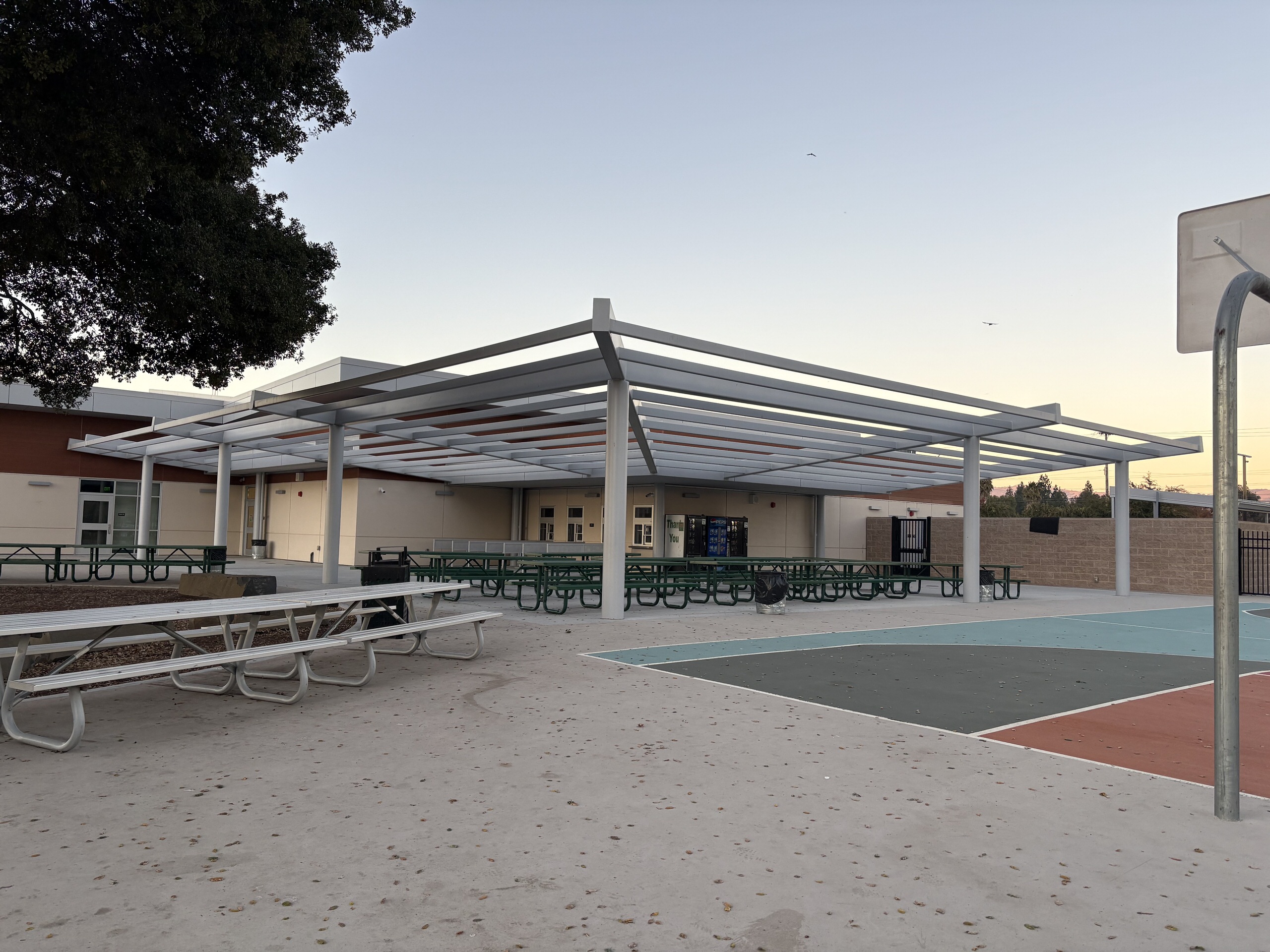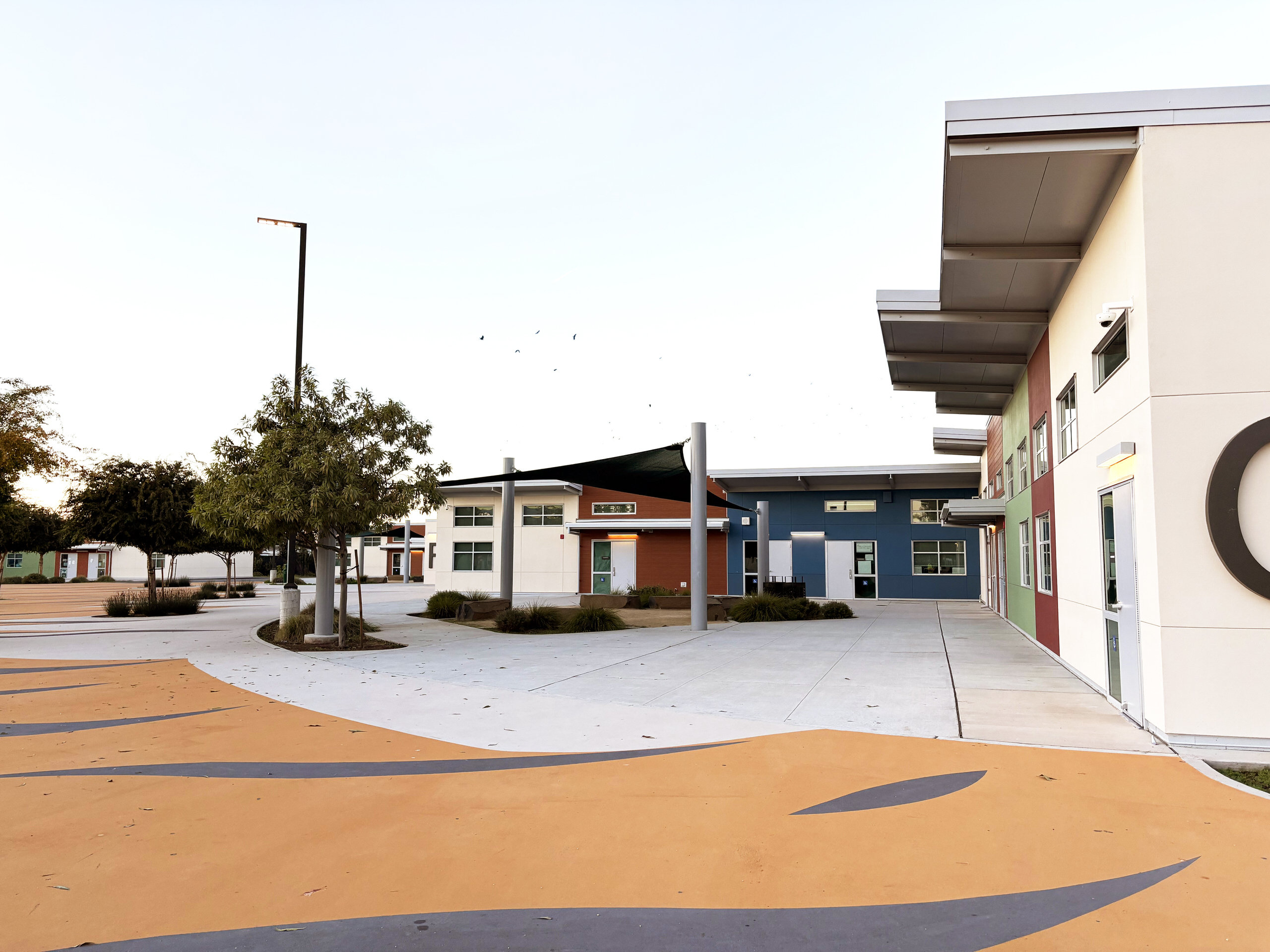 The campus includes a variety of outdoor gathering areas with fabric shade structures, turf and mulch landscaping, an outdoor amphitheater, covered lunch area, basketball courts, and seating areas. Curved seat walls provide informal gathering spaces between classroom buildings. The campus features young, growing trees that will provide increasing shade as they mature. The lunch area is covered by an open cell trellis. It would be beneficial to add a fabric material to the trellis to provide additional shade. The gym perimeter parking and drop-off areas are in excellent condition, featuring EV stalls, shade, seating areas, and efficient circulation.