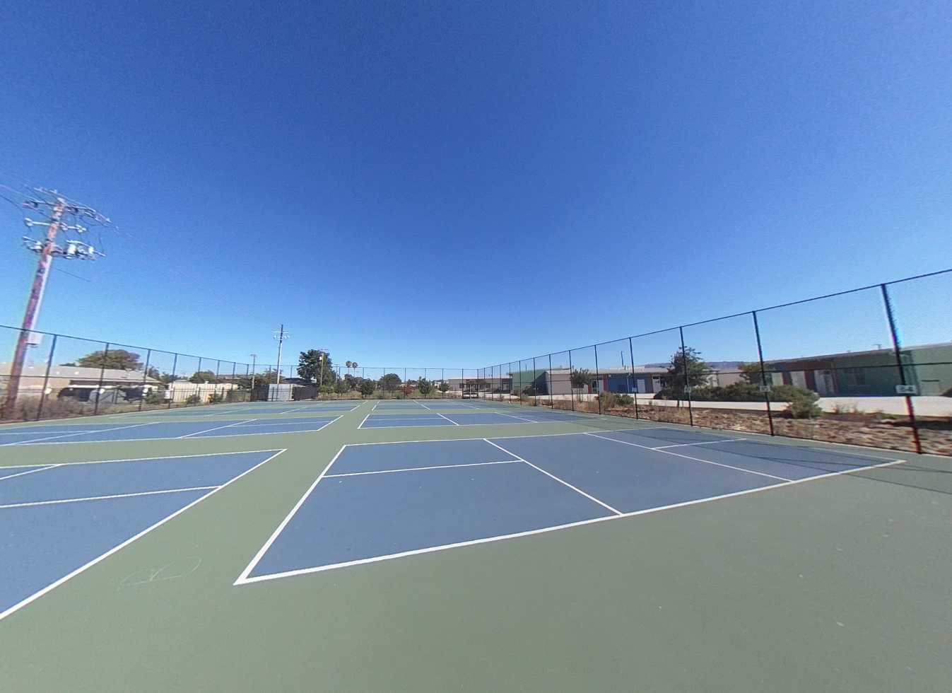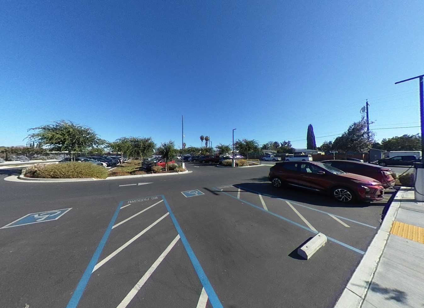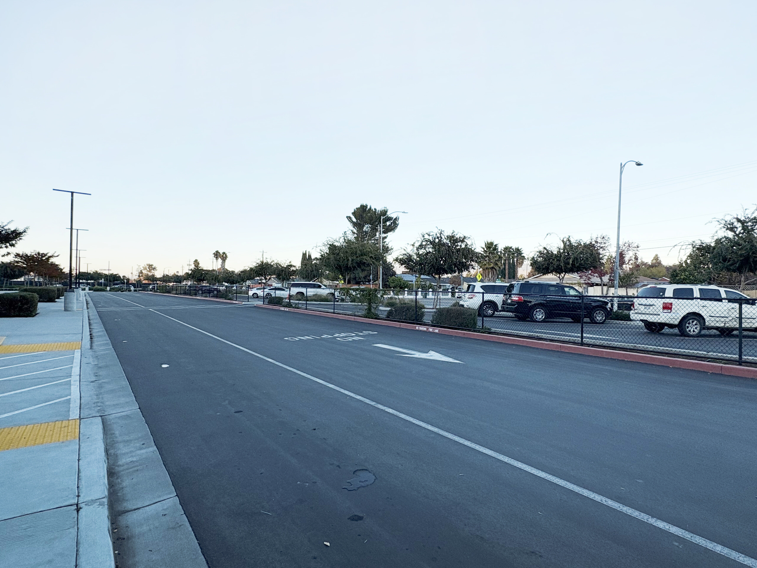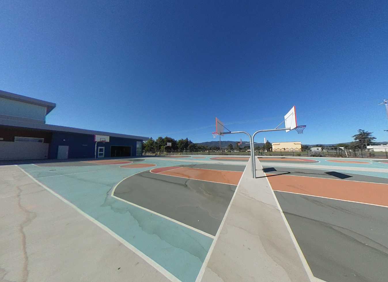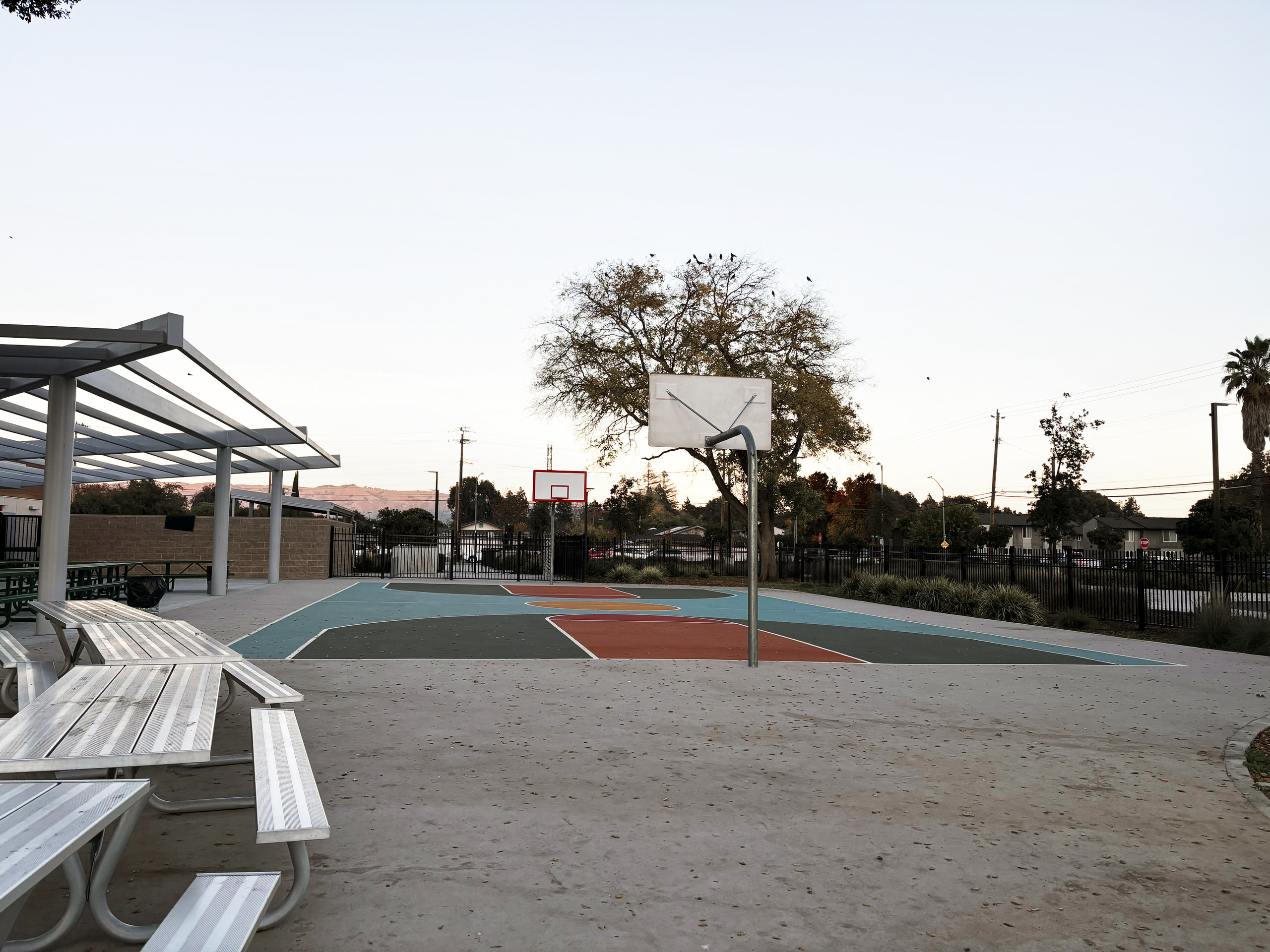 The campus includes a variety of outdoor gathering areas with fabric shade structures, turf and mulch landscaping, an outdoor amphitheater, covered lunch area, basketball courts, and seating areas. Curved seat walls provide informal gathering spaces between classroom buildings. The campus features young, growing trees that will provide increasing shade as they mature. The lunch area is covered by an open cell trellis. It would be beneficial to add a fabric material to the trellis to provide additional shade. The gym perimeter parking and drop-off areas are in excellent condition, featuring EV stalls, shade, seating areas, and efficient circulation.
