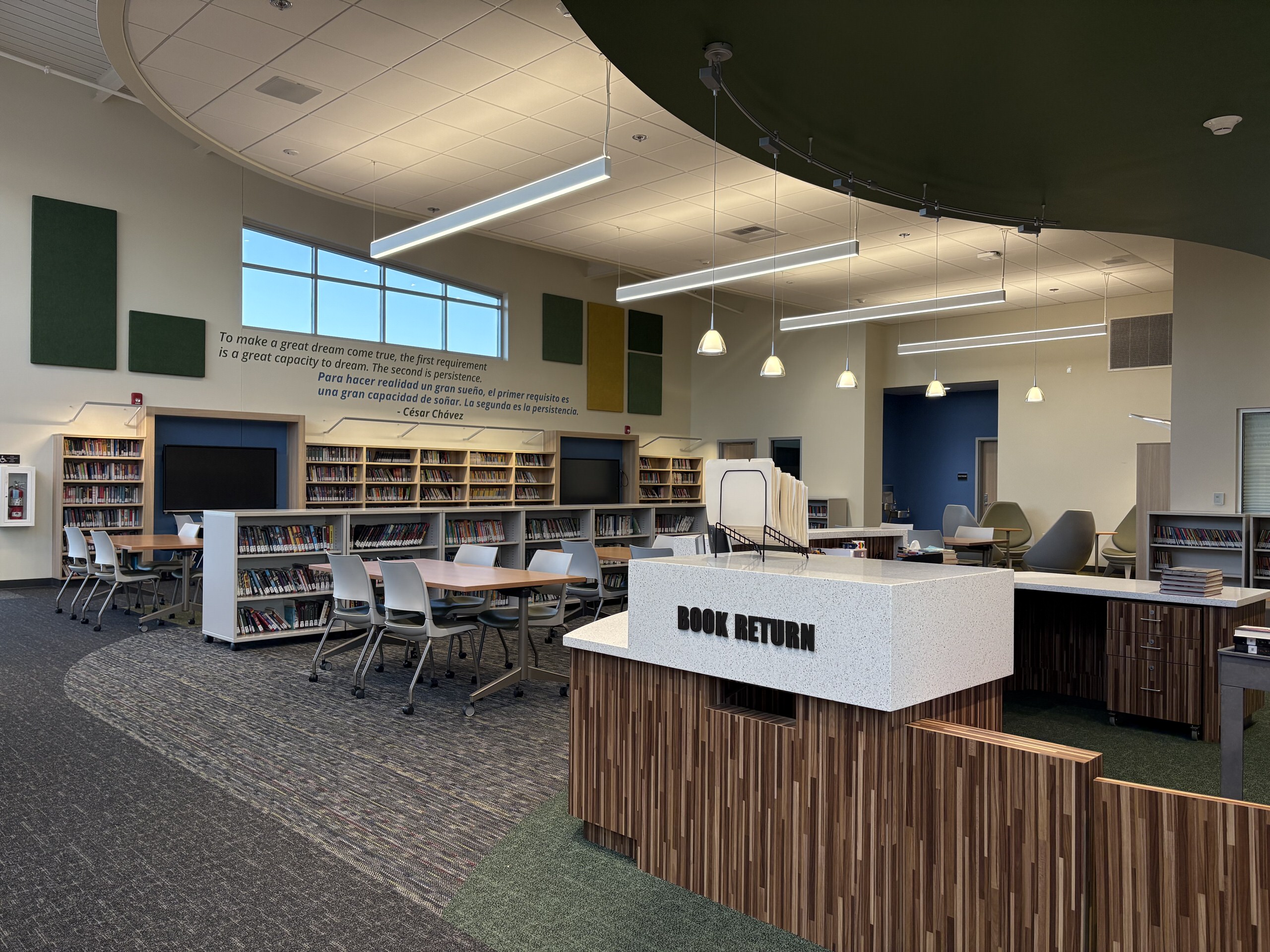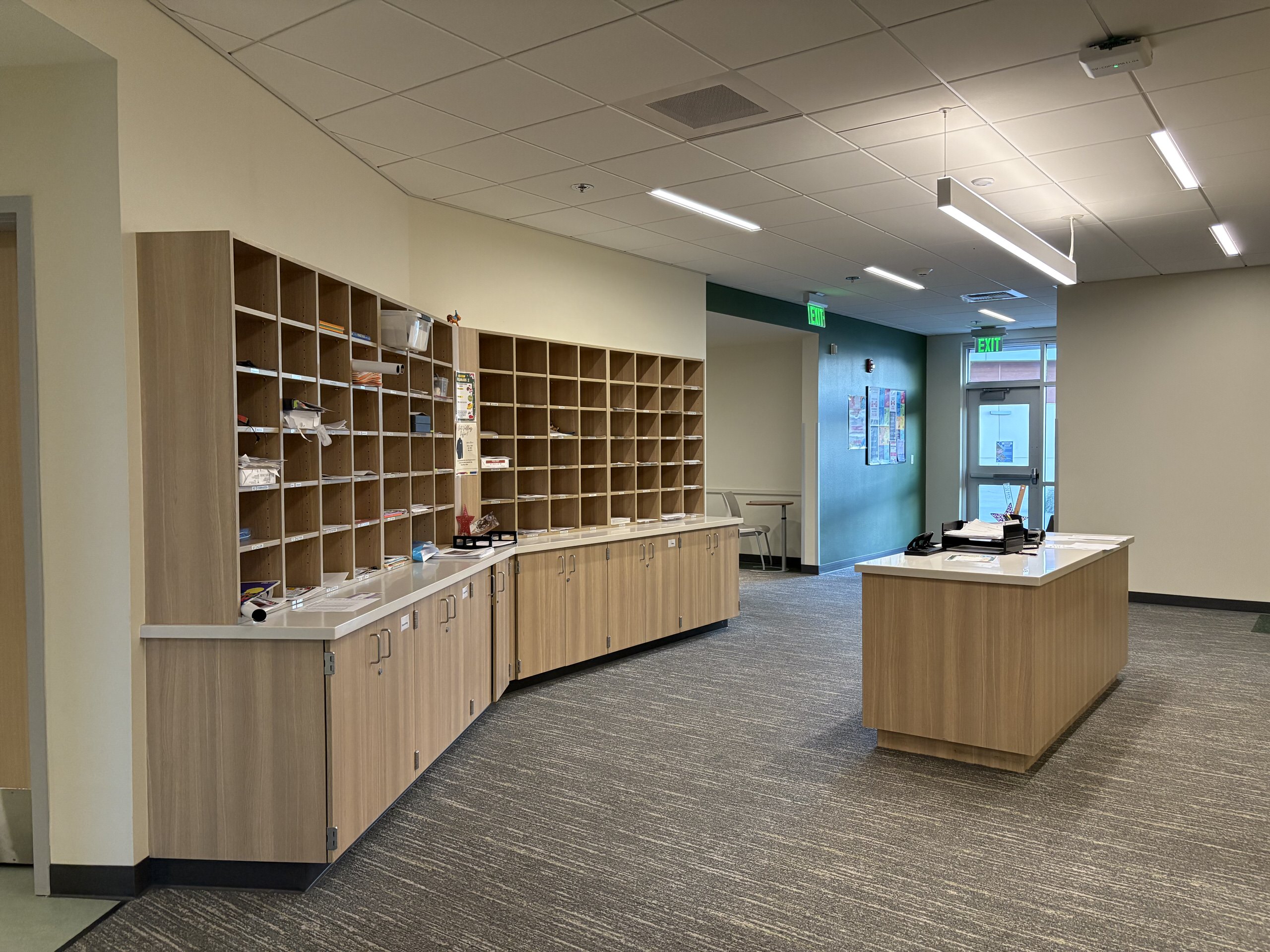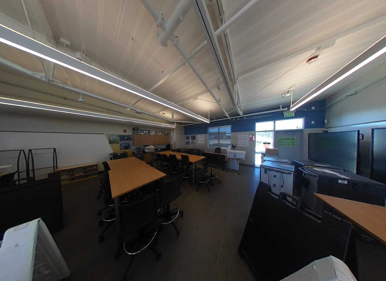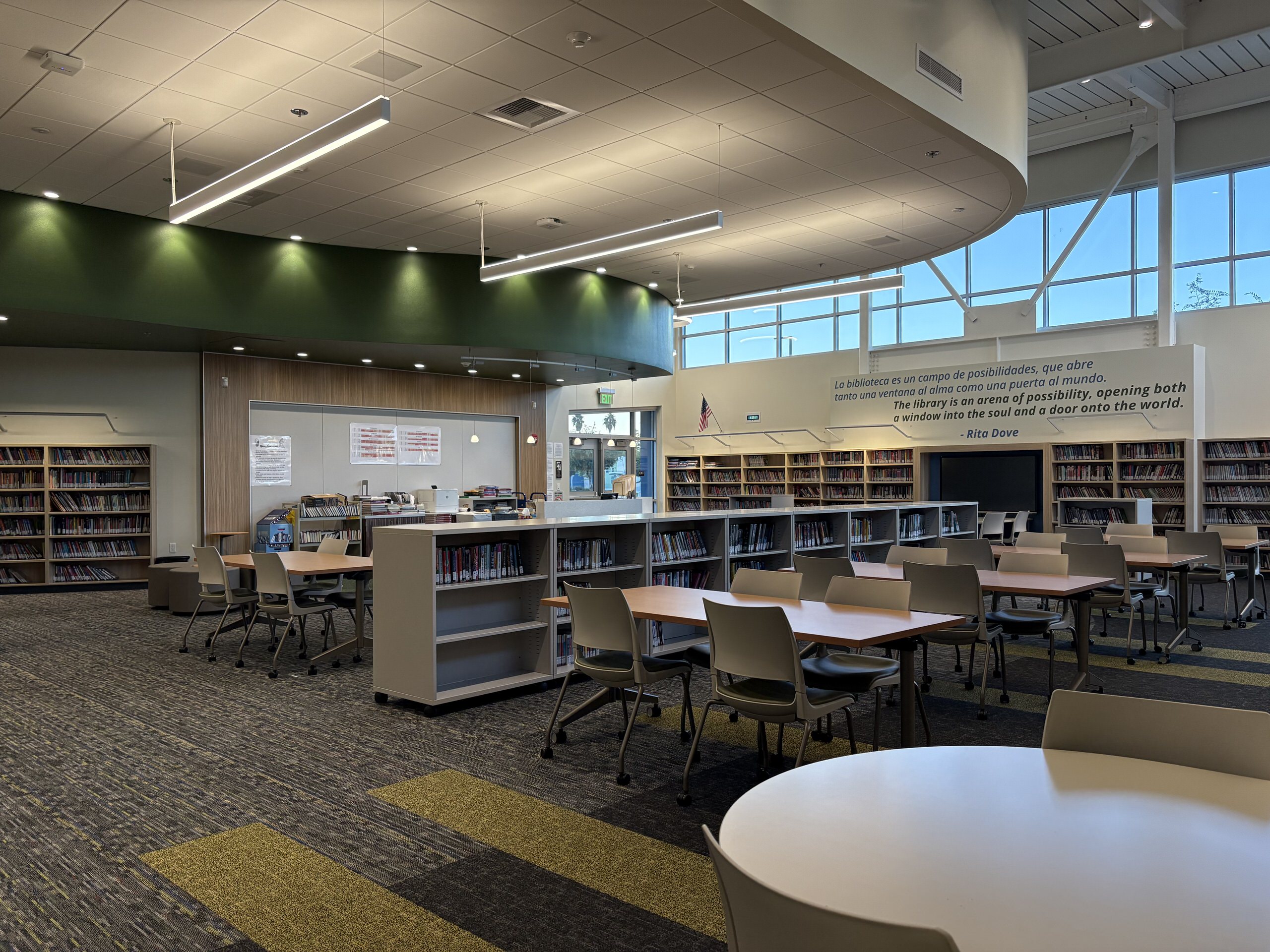 Building H houses, the administration complex, library, multi-purpose room, and room. The main lobby, facing the Murray Avenue drop-off, features a glazed vestibule leading to the administrative lobby, multi-purpose room, and central campus. The administrative area includes a colorful reception, principal’s office, open workspaces, conference rooms, nurse’s office, and support spaces. Storage and office spaces are ample, and interior finishes include carpet flooring with colorful accent walls. The library at the end of the corridor contains a reception desk, conference room, dedicated all-gender restroom, workroom, and bookstore. The library features high ceilings, clerestory windows with afternoon sunlight, suspended light fixtures, acoustic wall panels, perimeter book stacks, and flexible furniture. Overall, Building H’s lobby, administration, and library are in great condition.