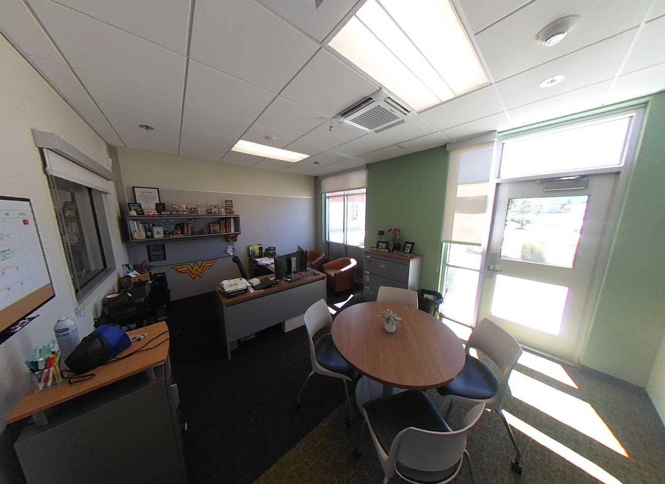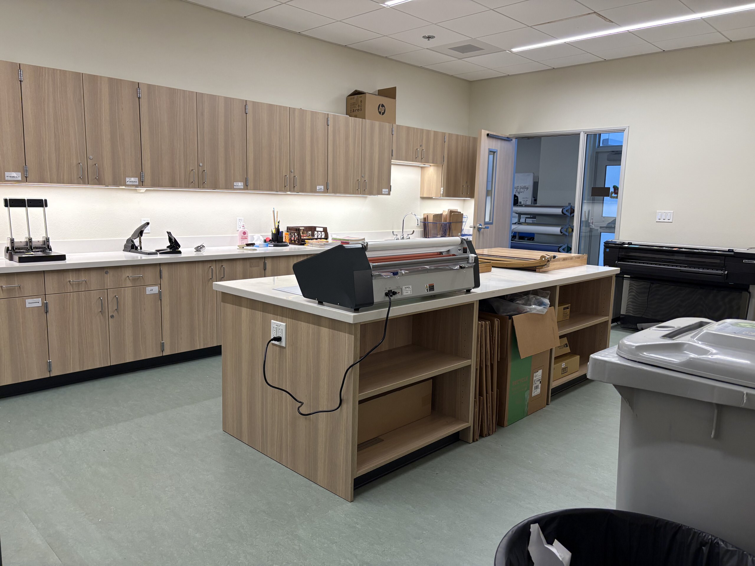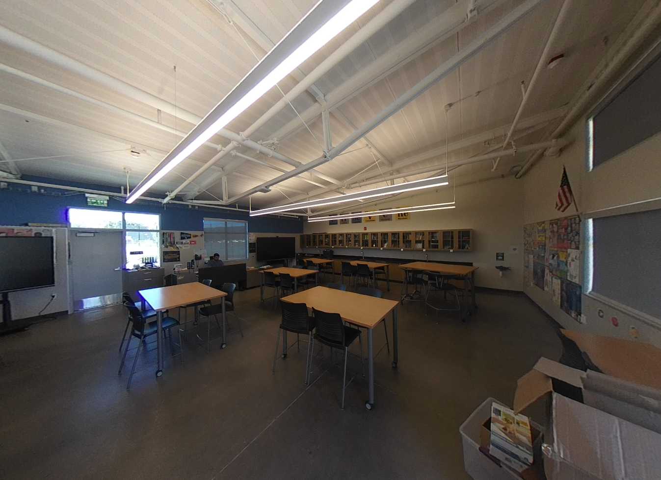 Building H houses, the administration complex, library, multi-purpose room, and room. The main lobby, facing the Murray Avenue drop-off, features a glazed vestibule leading to the administrative lobby, multi-purpose room, and central campus. The administrative area includes a colorful reception, principal’s office, open workspaces, conference rooms, nurse’s office, and support spaces. Storage and office spaces are ample, and interior finishes include carpet flooring with colorful accent walls. The library at the end of the corridor contains a reception desk, conference room, dedicated all-gender restroom, workroom, and bookstore. The library features high ceilings, clerestory windows with afternoon sunlight, suspended light fixtures, acoustic wall panels, perimeter book stacks, and flexible furniture. Overall, Building H’s lobby, administration, and library are in great condition.