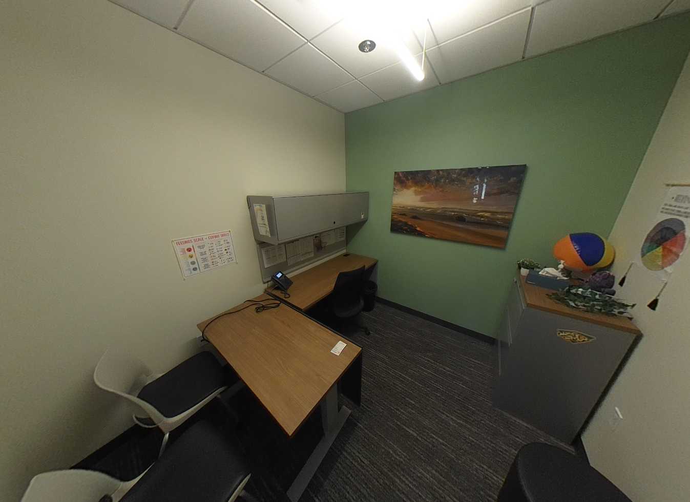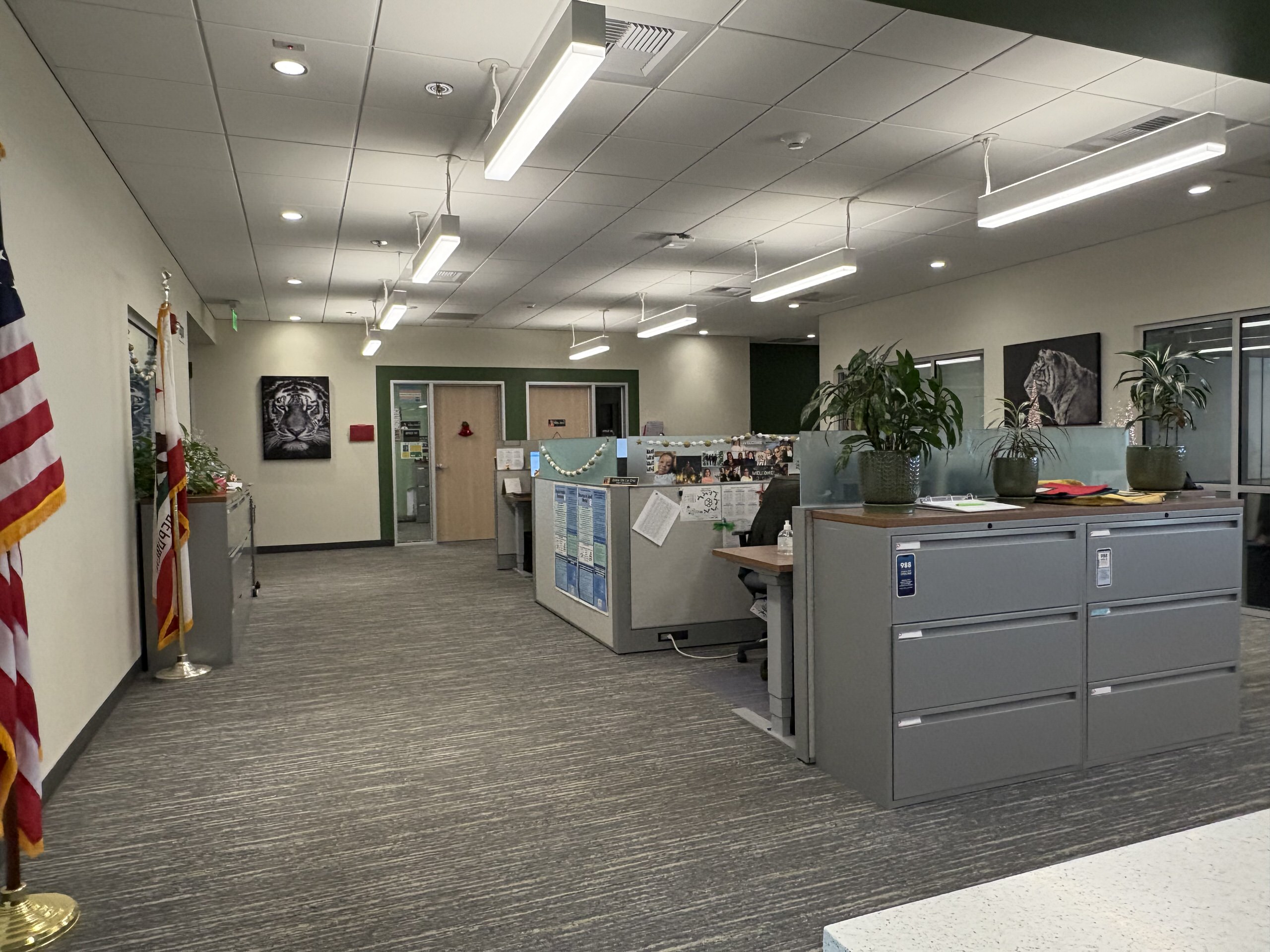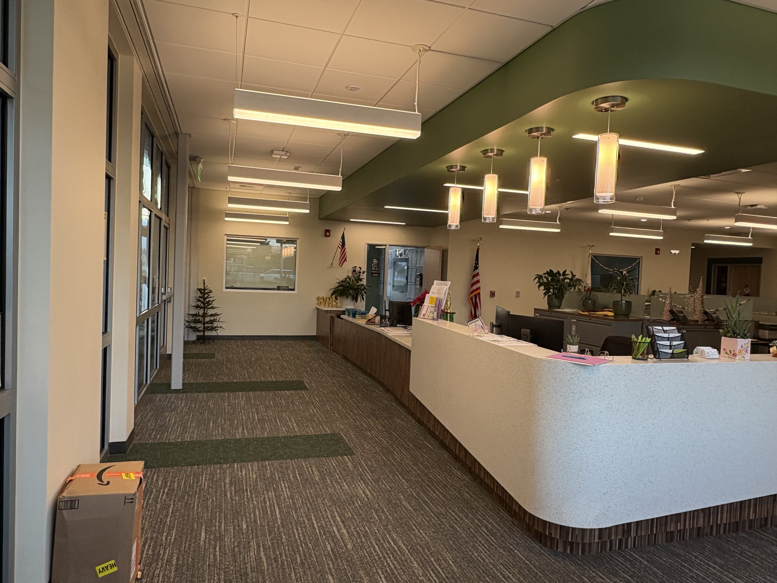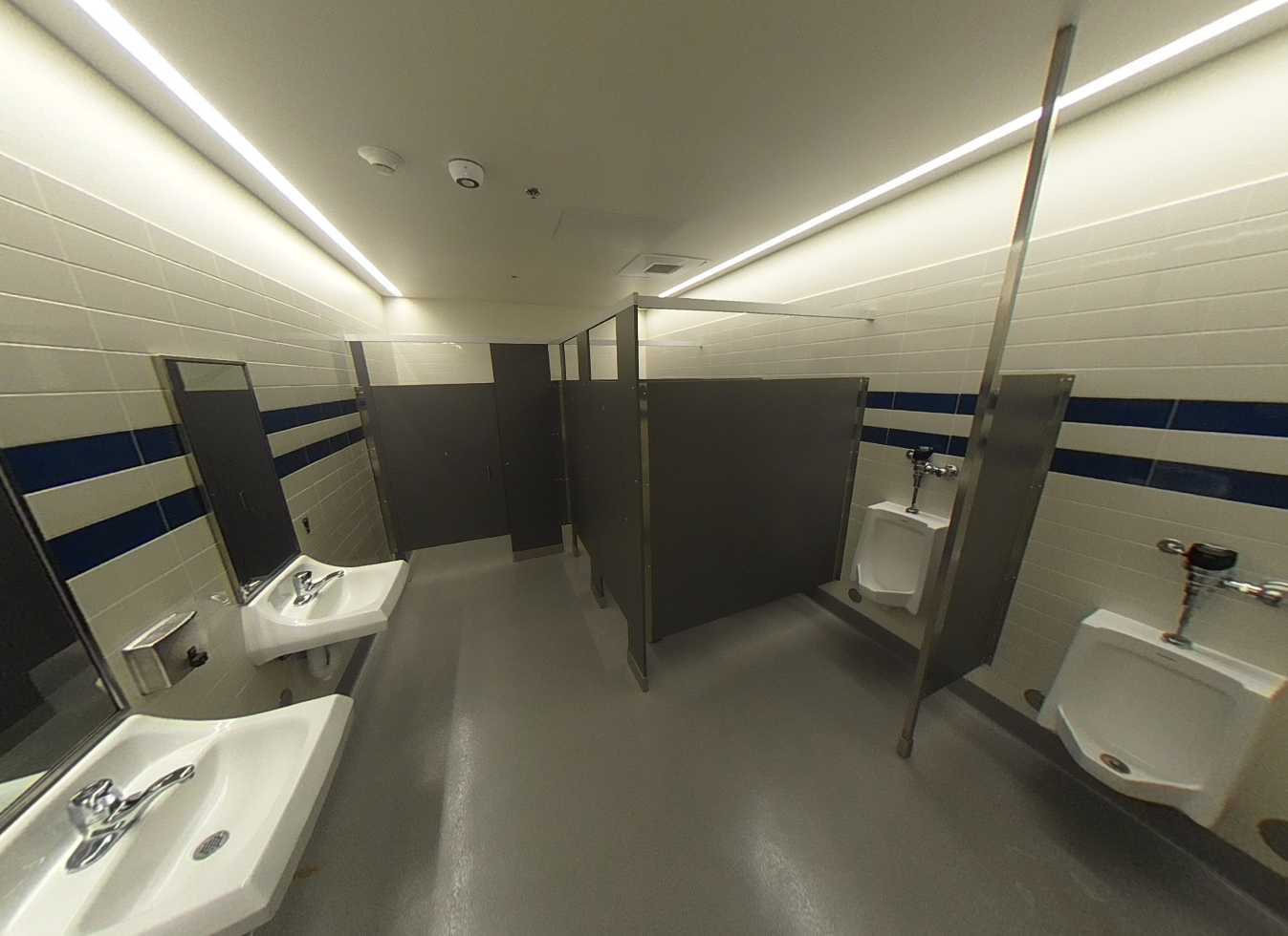 Building H houses, the administration complex, library, multi-purpose room, and room. The main lobby, facing the Murray Avenue drop-off, features a glazed vestibule leading to the administrative lobby, multi-purpose room, and central campus. The administrative area includes a colorful reception, principal’s office, open workspaces, conference rooms, nurse’s office, and support spaces. Storage and office spaces are ample, and interior finishes include carpet flooring with colorful accent walls. The library at the end of the corridor contains a reception desk, conference room, dedicated all-gender restroom, workroom, and bookstore. The library features high ceilings, clerestory windows with afternoon sunlight, suspended light fixtures, acoustic wall panels, perimeter book stacks, and flexible furniture. Overall, Building H’s lobby, administration, and library are in great condition.