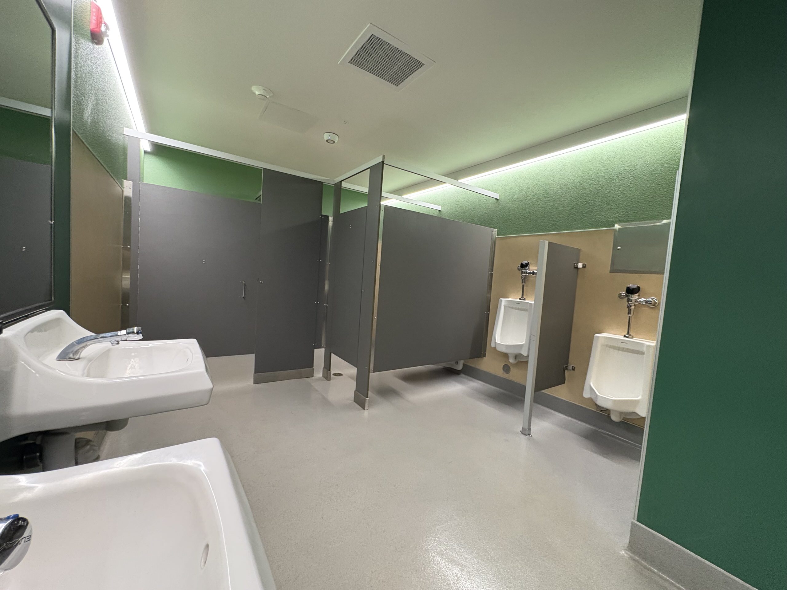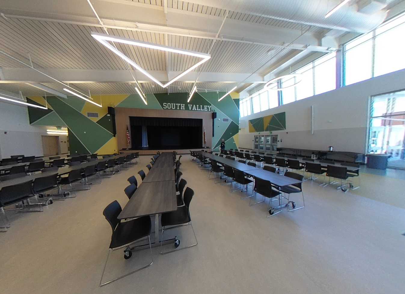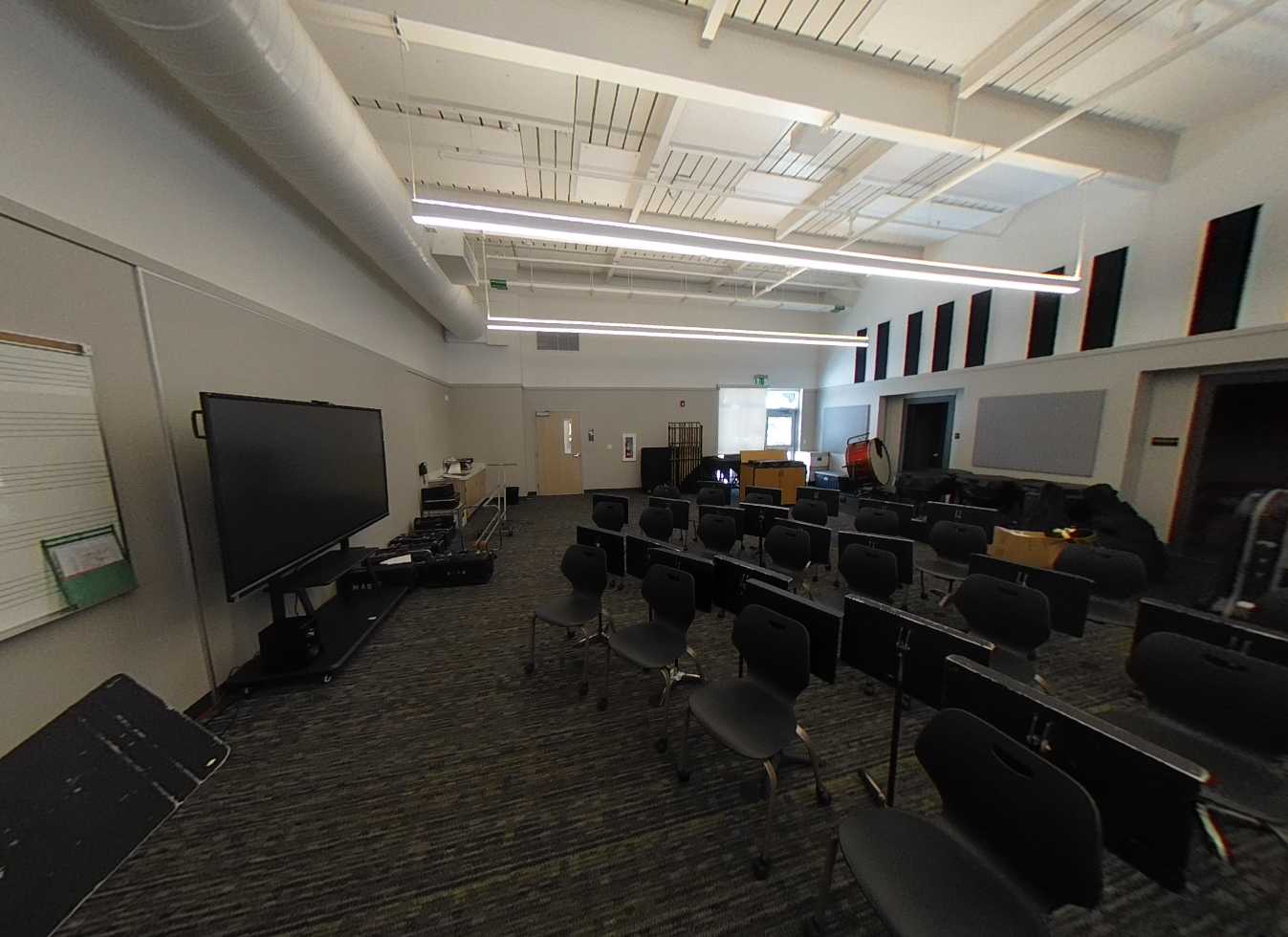 The multi-purpose room is located to the left of the main lobby. It has clerestory windows, storefront views, high slanted ceilings, shaped suspended lighting and acoustic panels. There is a large stage which has plenty of storage space, an accessible lift, and theater curtains. The adjacent music room contains a rehearsal space, practice rooms, instrument storage, and office, finished with carpet flooring and acoustic treatments. Support spaces, including the kitchen, storage, and restrooms. The kitchen features a roll-up service door to connect the server to the multi-purpose room and an outdoor service window to the quad lunch area. Overall, the multi-purpose area is colorful, functional, and in good condition.