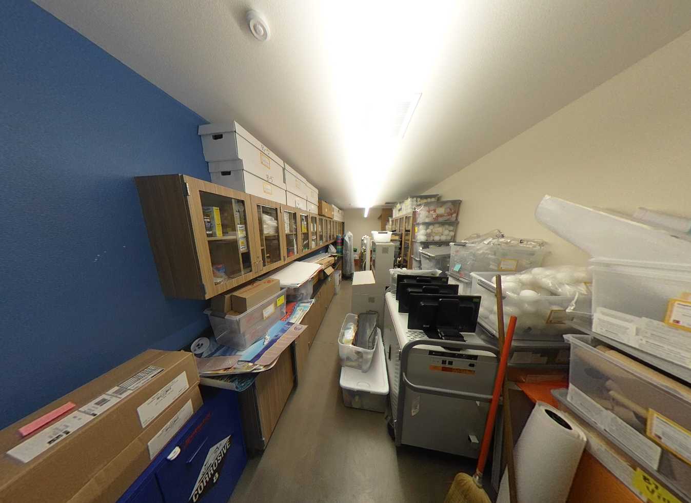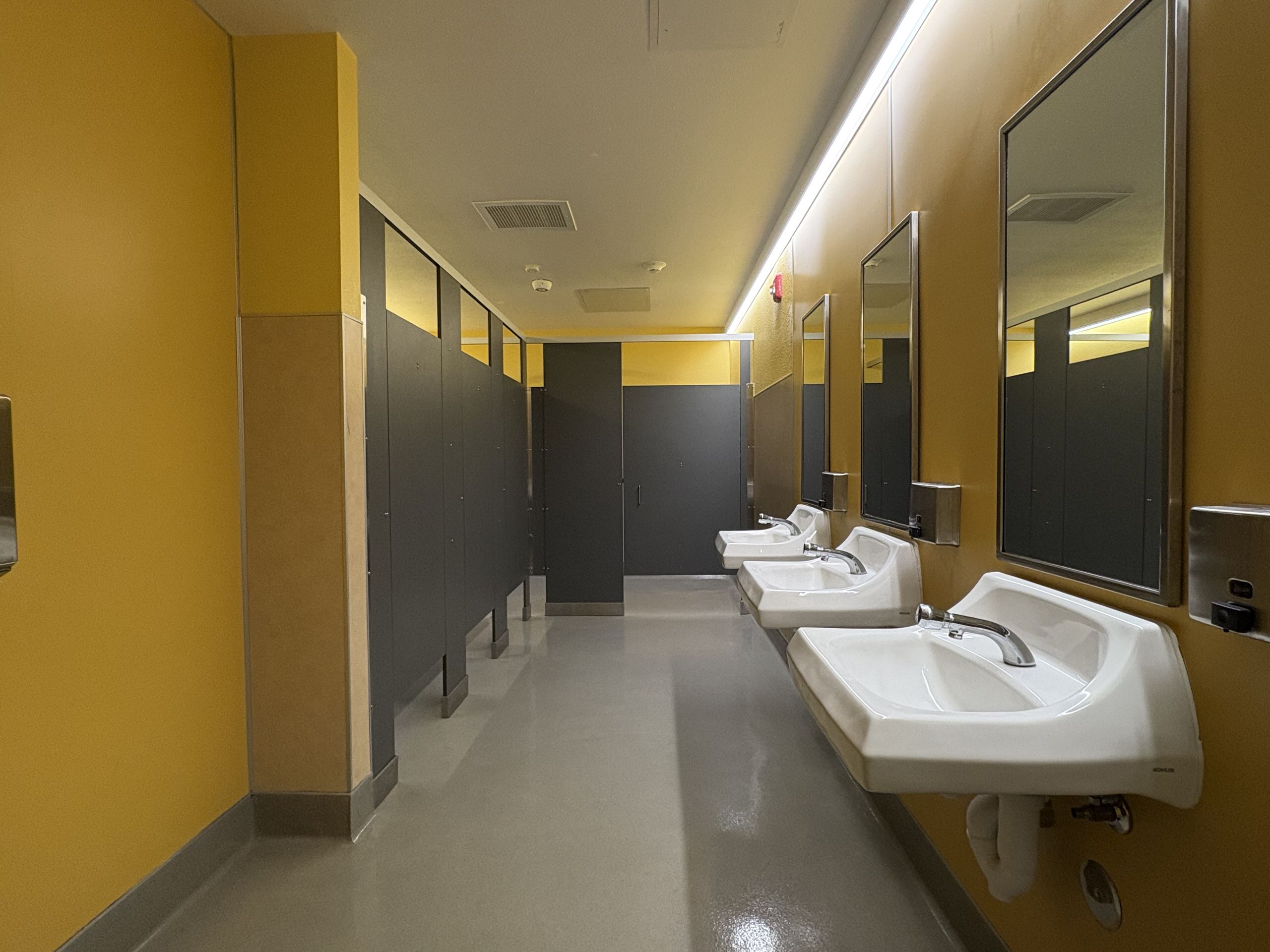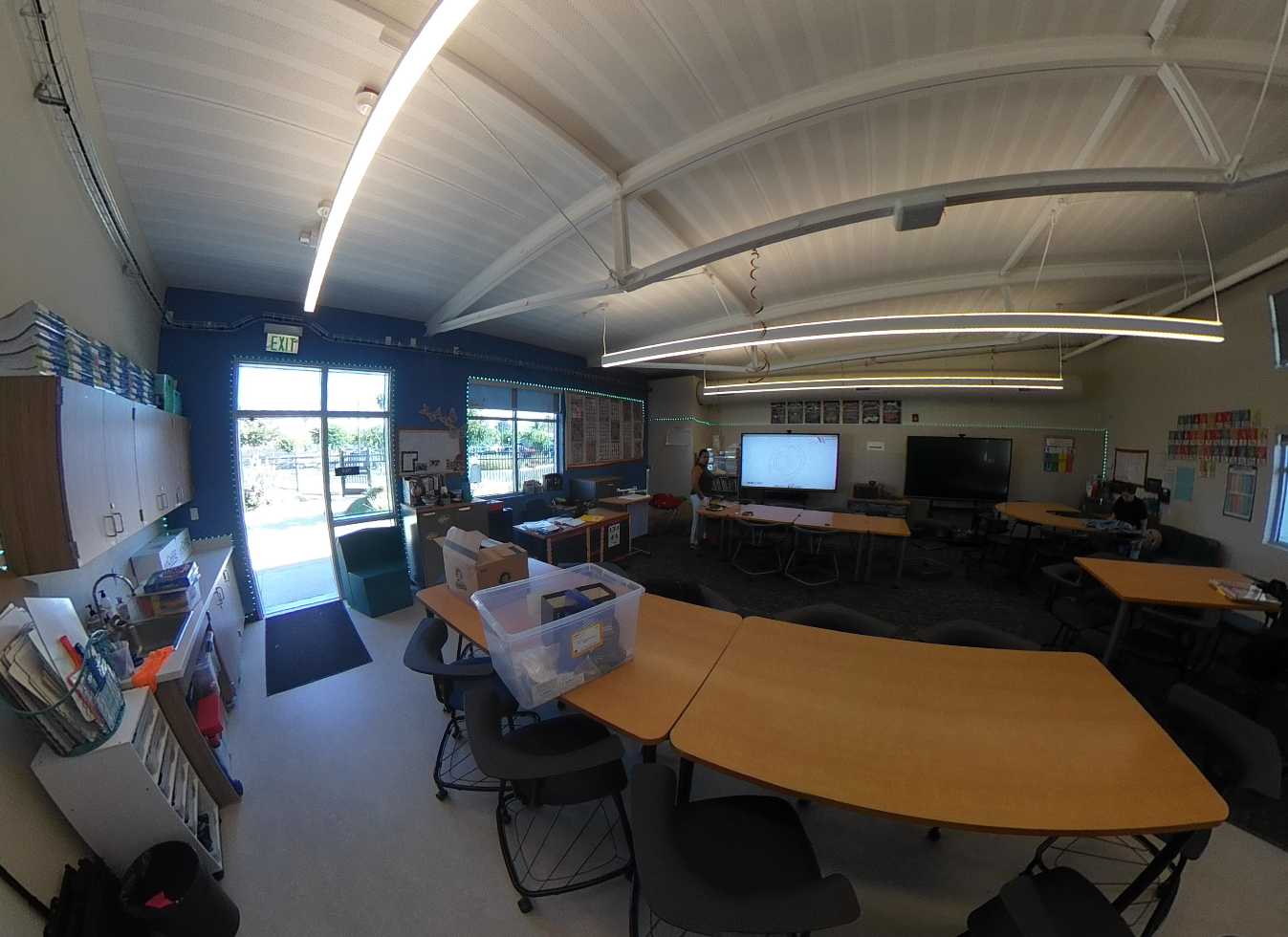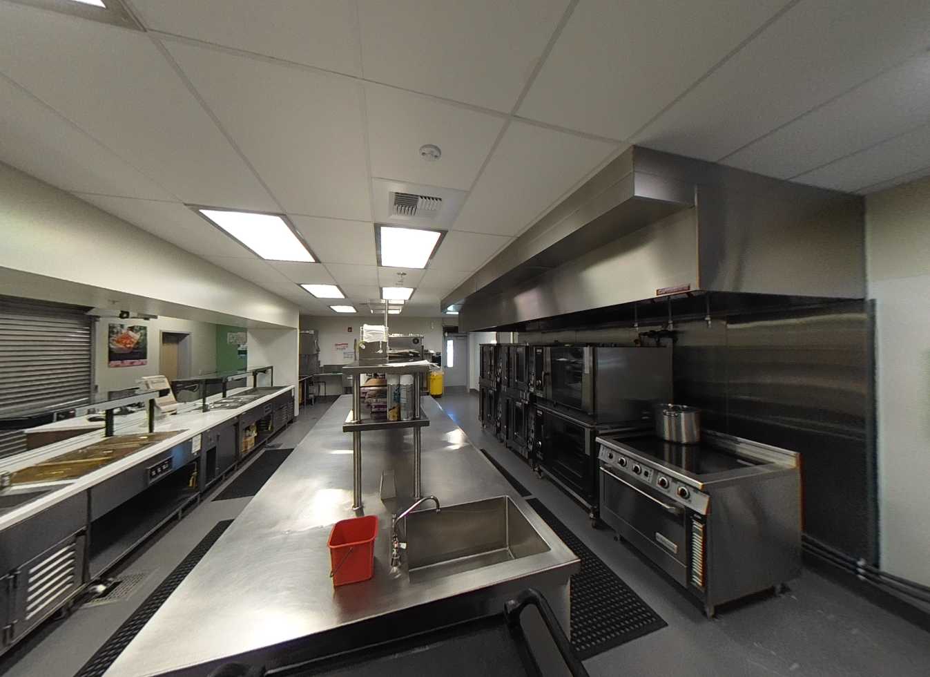 The multi-purpose room is located to the left of the main lobby. It has clerestory windows, storefront views, high slanted ceilings, shaped suspended lighting and acoustic panels. There is a large stage which has plenty of storage space, an accessible lift, and theater curtains. The adjacent music room contains a rehearsal space, practice rooms, instrument storage, and office, finished with carpet flooring and acoustic treatments. Support spaces, including the kitchen, storage, and restrooms. The kitchen features a roll-up service door to connect the server to the multi-purpose room and an outdoor service window to the quad lunch area. Overall, the multi-purpose area is colorful, functional, and in good condition.