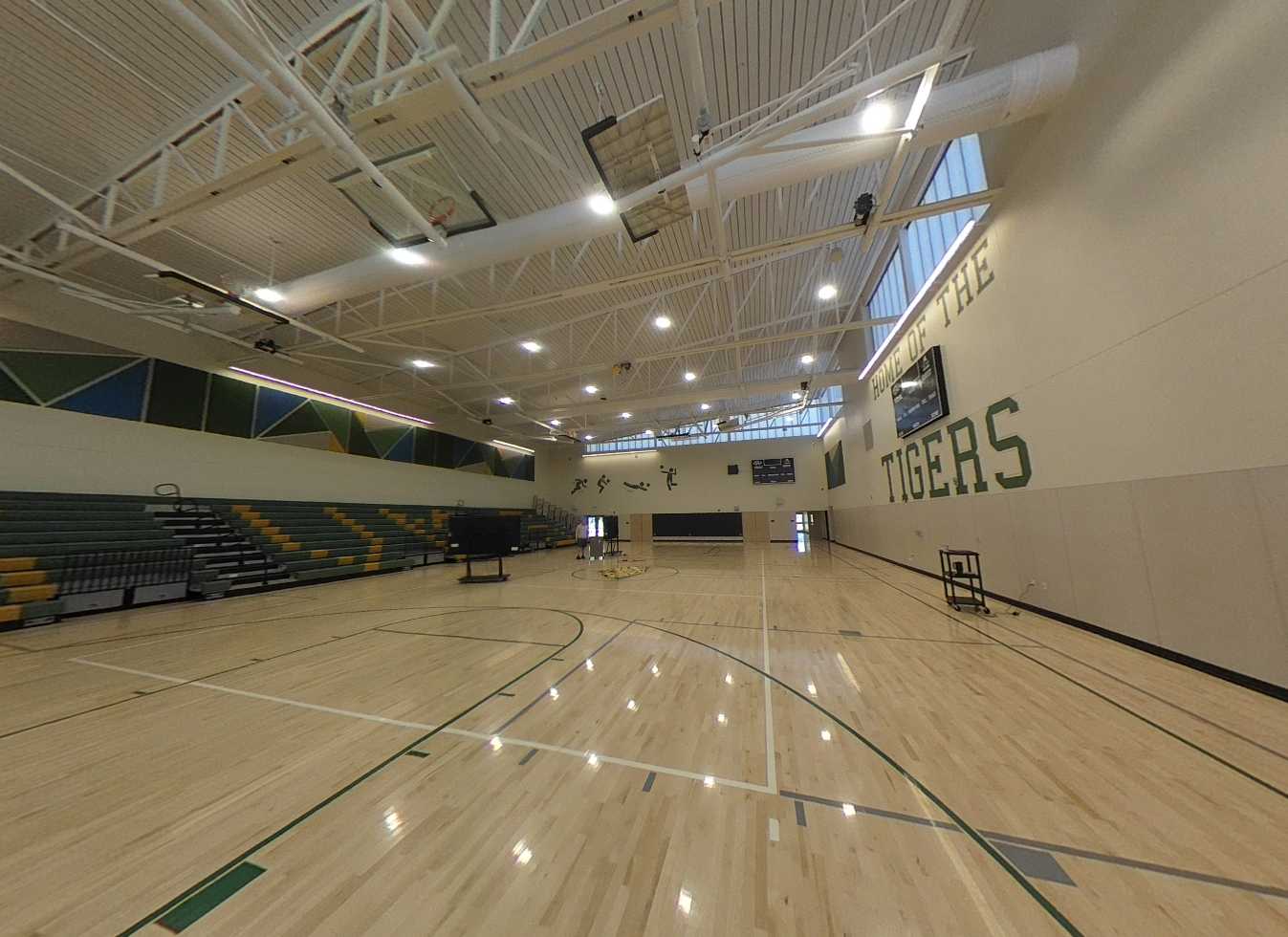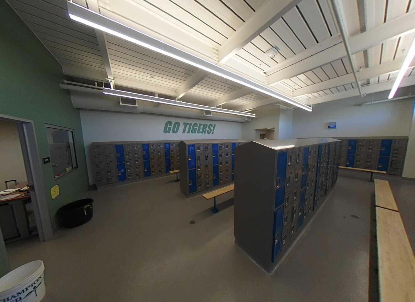 The gym is located adjacent to the track, field, and basketball courts, with a lobby facing IOOF Avenue. The interior features high slanted ceilings, acoustic wall panels, clerestory windows, padded wall protection, and bleachers. Locker rooms are equipped with accessible restrooms, benches, and a mix of five-tier and two-tier lockers. Support spaces include offices, storage, a practice room, and a weight room. The gym is functional and in good condition.