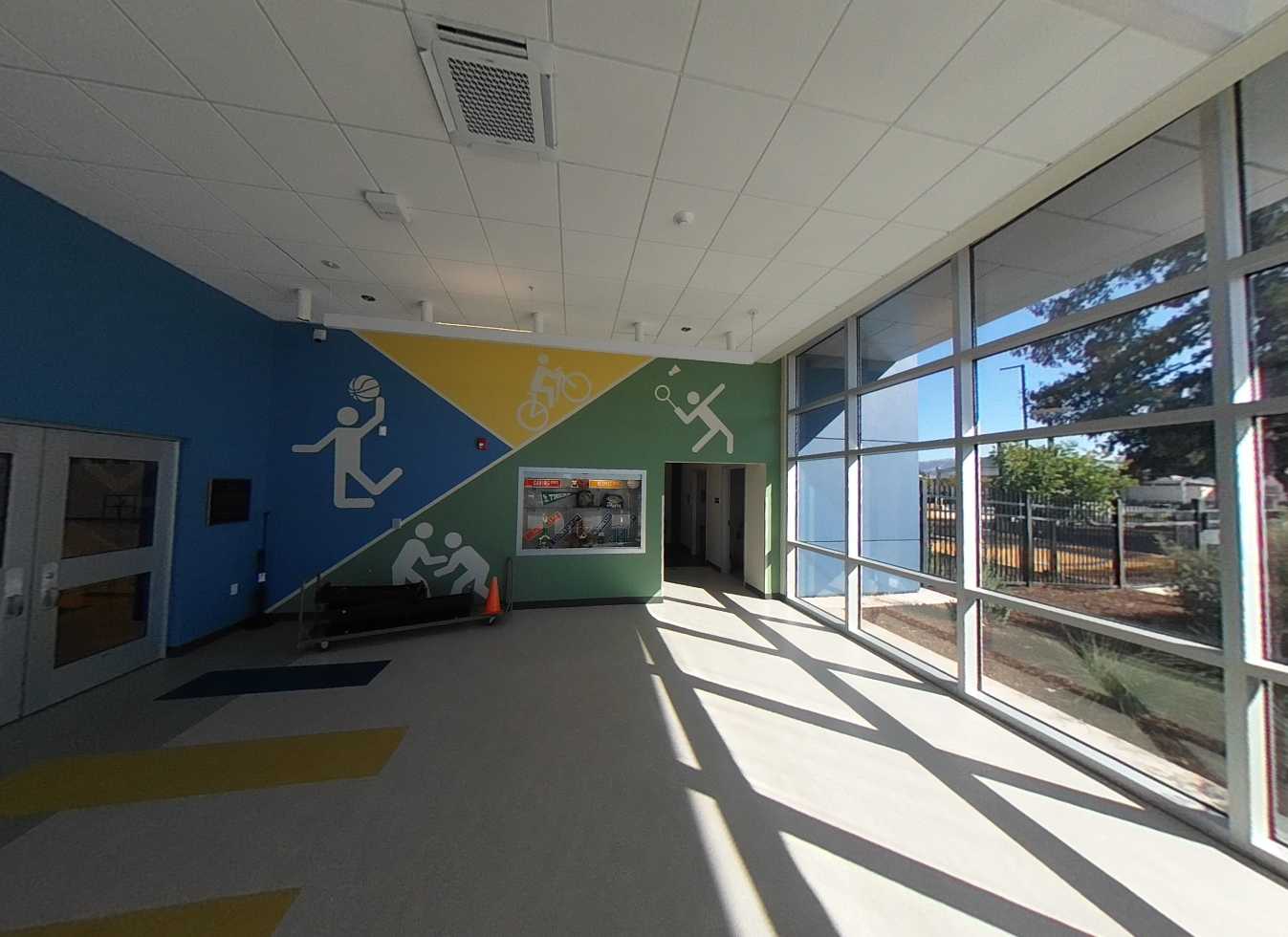 Exterior finishes feature colorful stucco facades in beige, green, blue, and red, accented with wood-look paneling. Roofs are standing-seam metal, in great condition. Windows and clerestory glazing provide ample natural light throughout. Interior finishes are durable and well-maintained. Areas requiring attention include basketball court paint and classroom whiteboards.